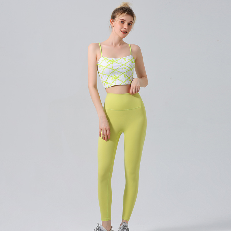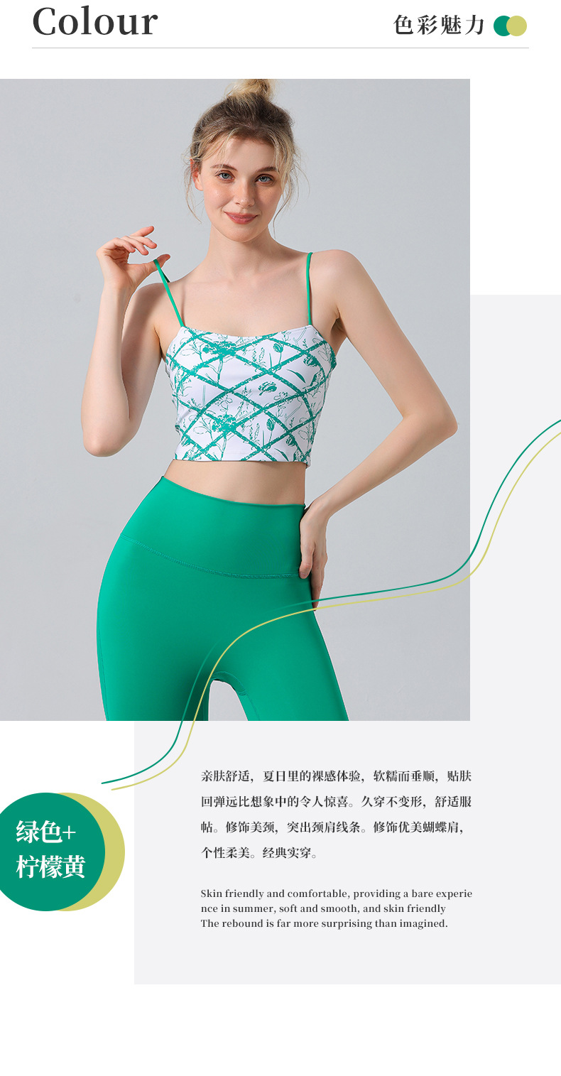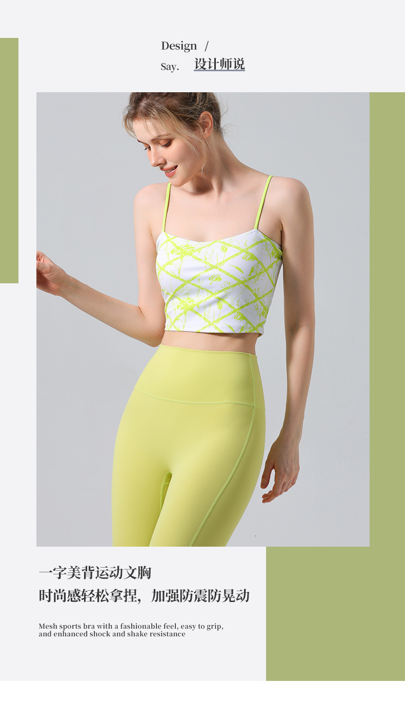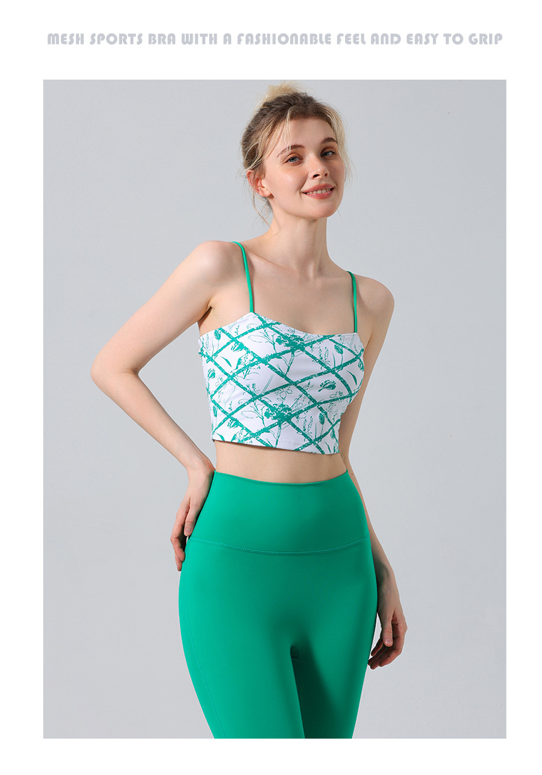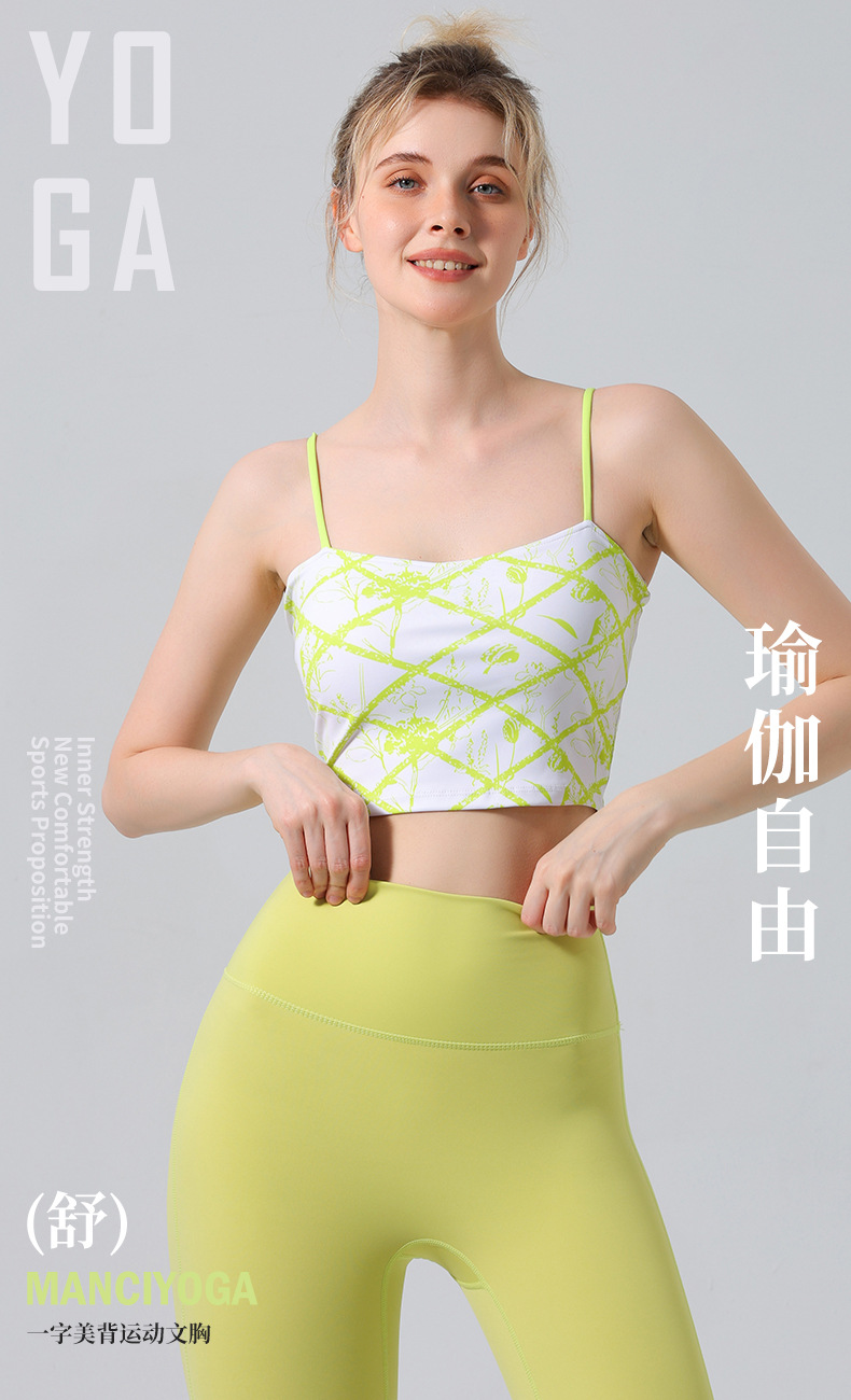 格纹印花恋花裸感文胸运动瑜伽服背心健身跑步套装吊带胸垫聚拢女