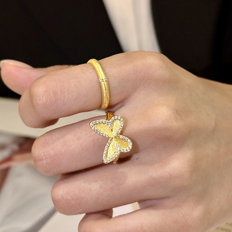 小红书爆款拉丝闪钻蝴蝶戒指女古法新中式金色爆闪小蝴蝶精致指环