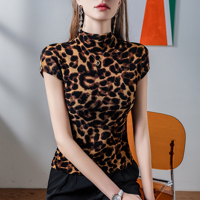 豹纹印花小立领T恤女短袖夏季新款女人味包袖时髦蕾丝打底衫