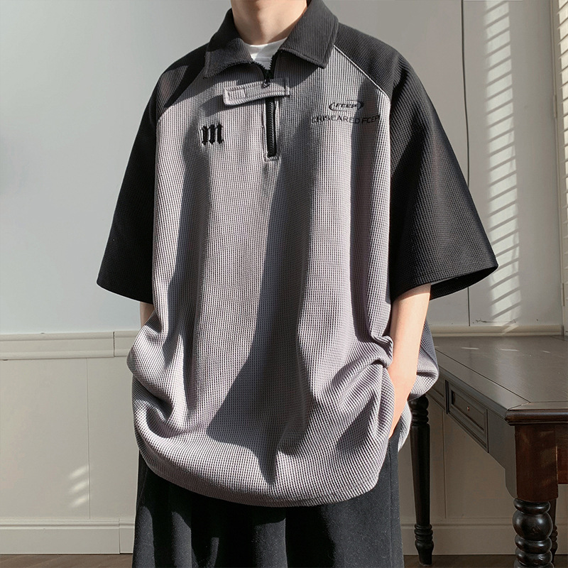 华夫格POLO衫男夏季小众设计感撞色上衣宽松休闲潮牌学生短袖t恤
