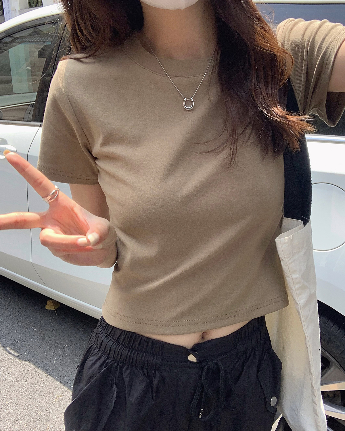 甜辣风修身露肚正肩圆领短袖T恤女夏季高腰显瘦辣妹短款百搭上衣