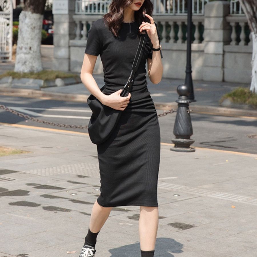 【价值高于价格】抽绳收腰显瘦连衣裙女夏季新款短袖过膝长裙