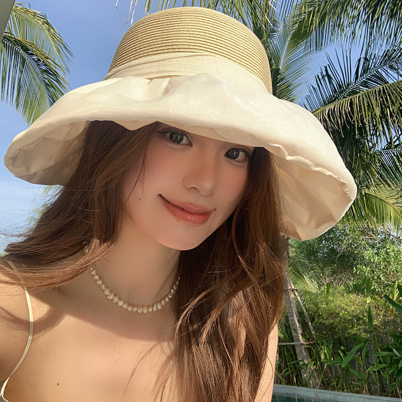 韩系遮阳草帽女欧根纱蝴蝶结草编帽夏海边度假网红拍照防晒渔夫帽