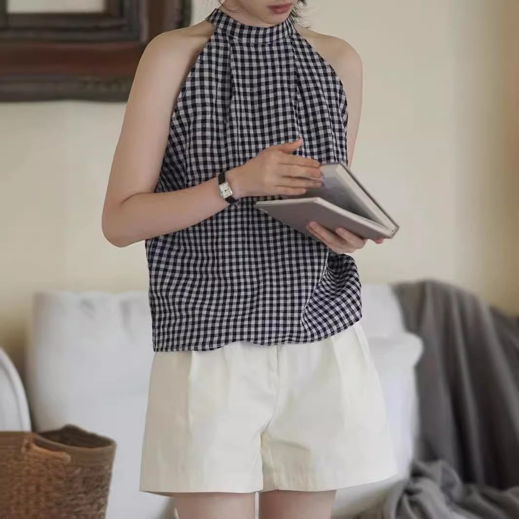 ‘剑桥走廊’苎麻色织格纹系脖上衣背心无袖衬衫