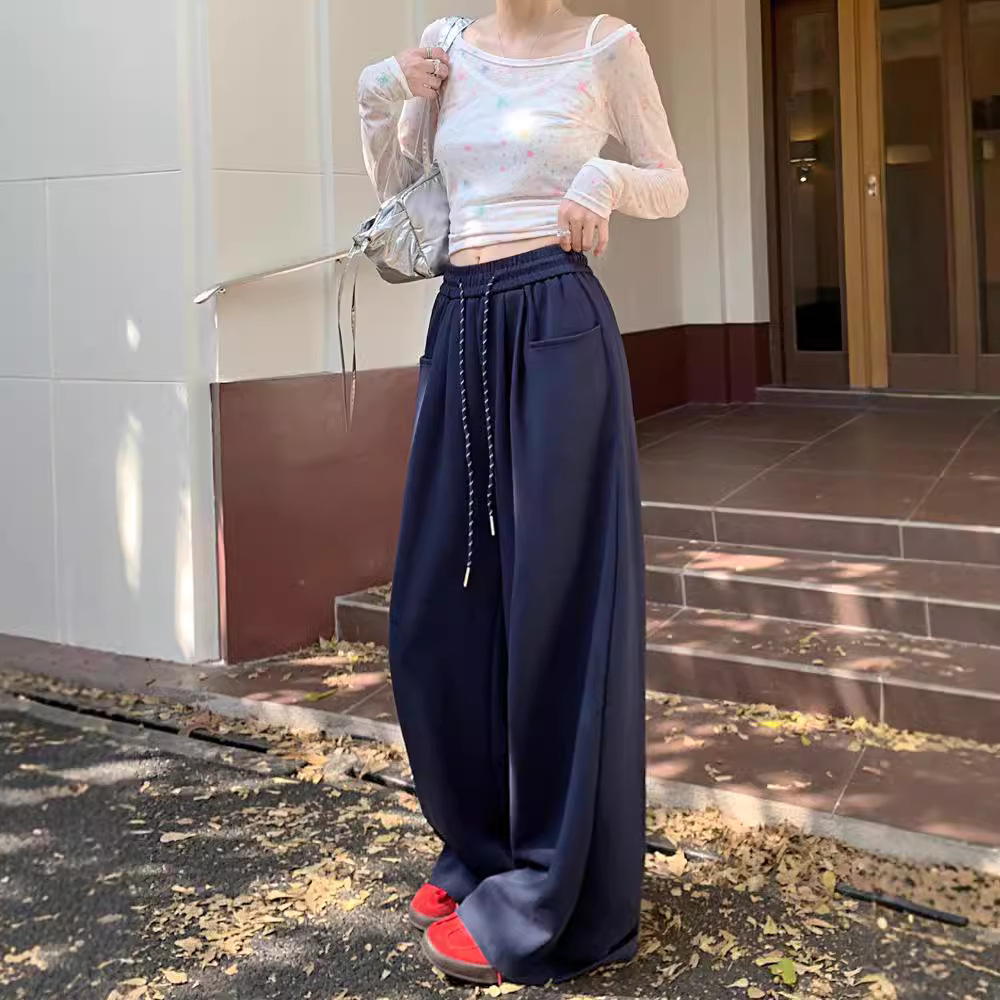 抽绳高腰阔腿裤垂感拖地裤女秋季新款百搭慵懒风休闲卫裤长裤