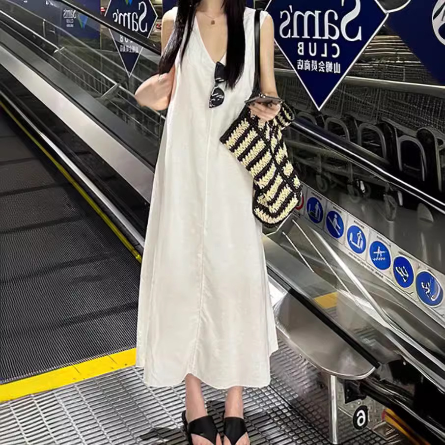 白色亚麻连衣裙女夏日小众温柔舒适清爽简约显瘦V领长裙遛弯度假