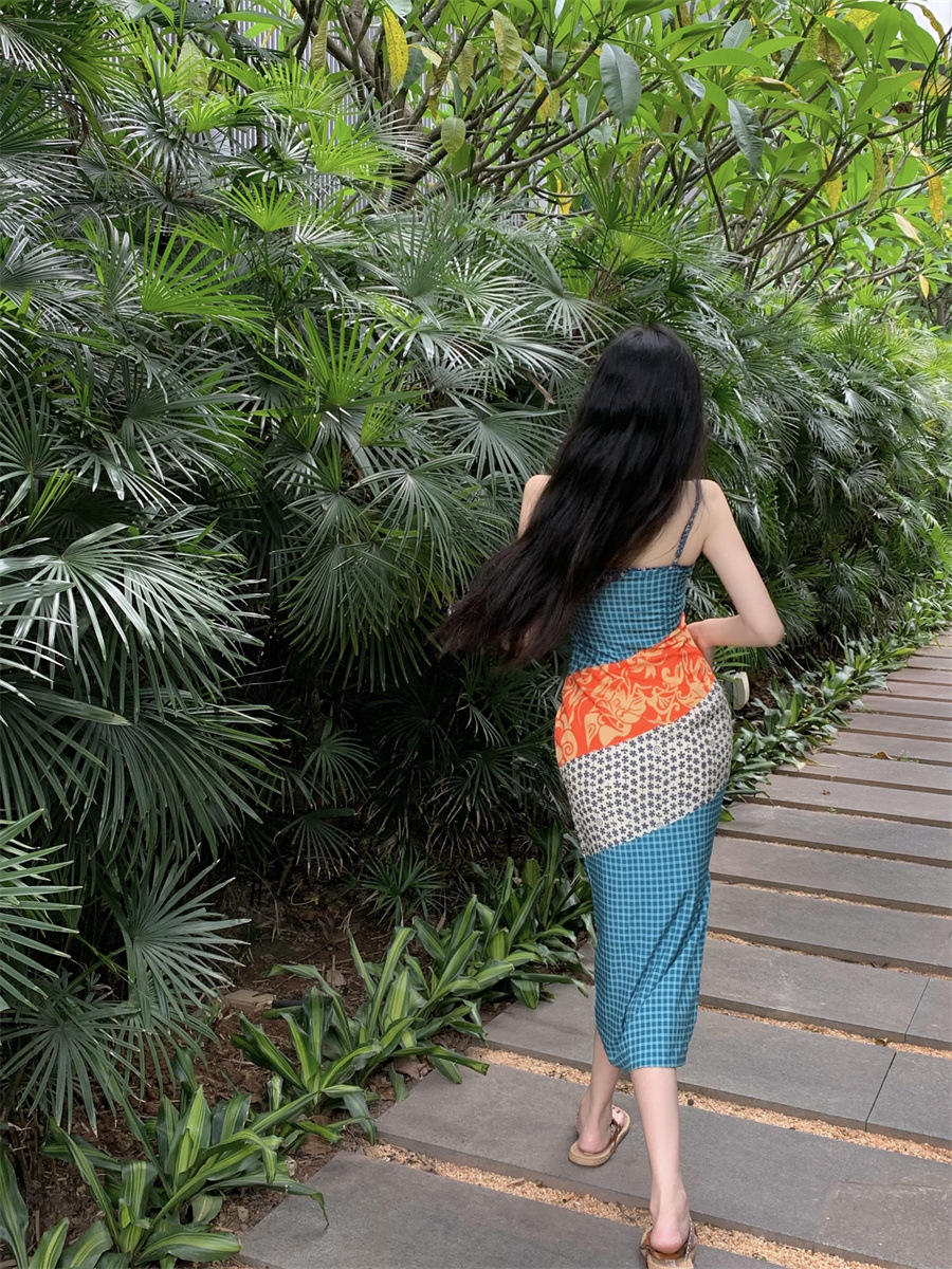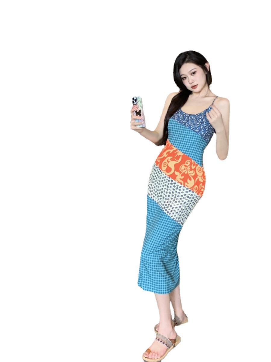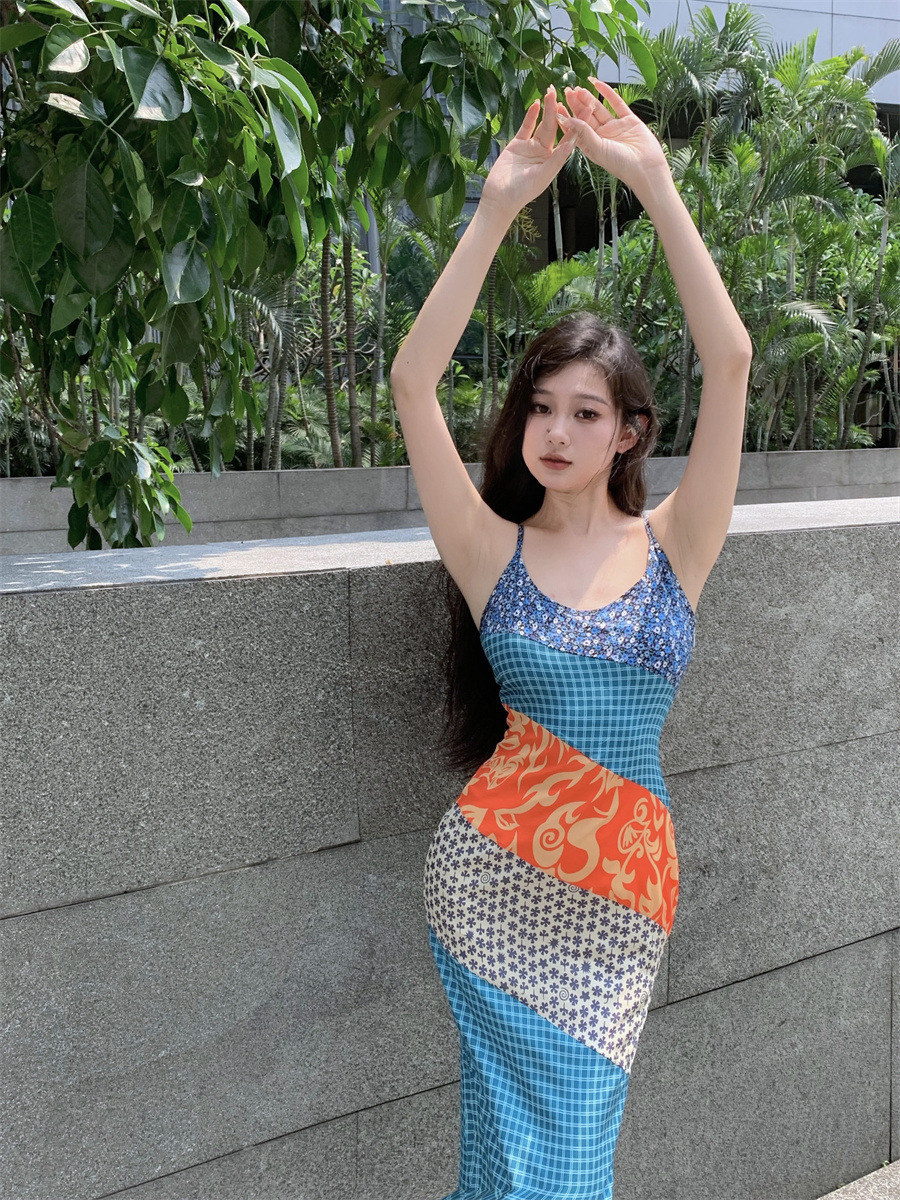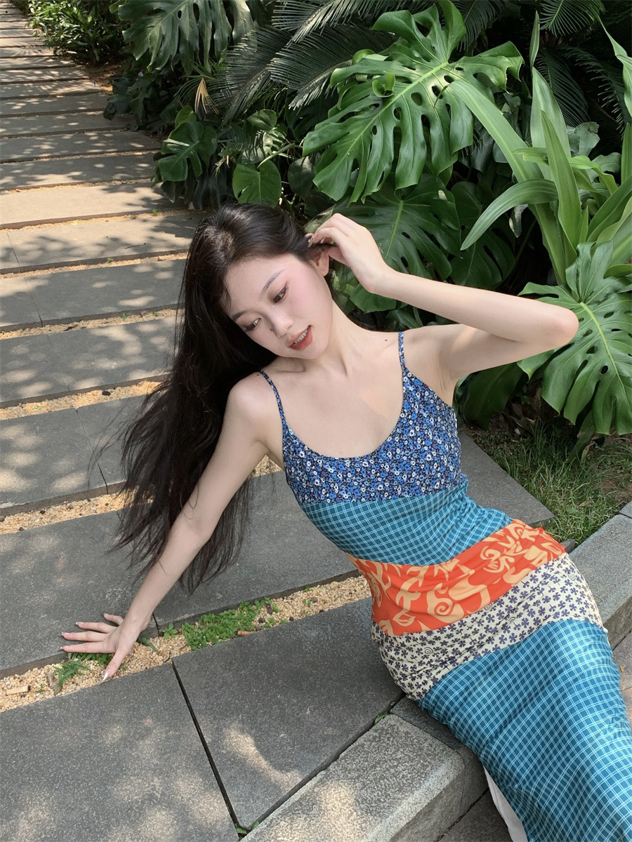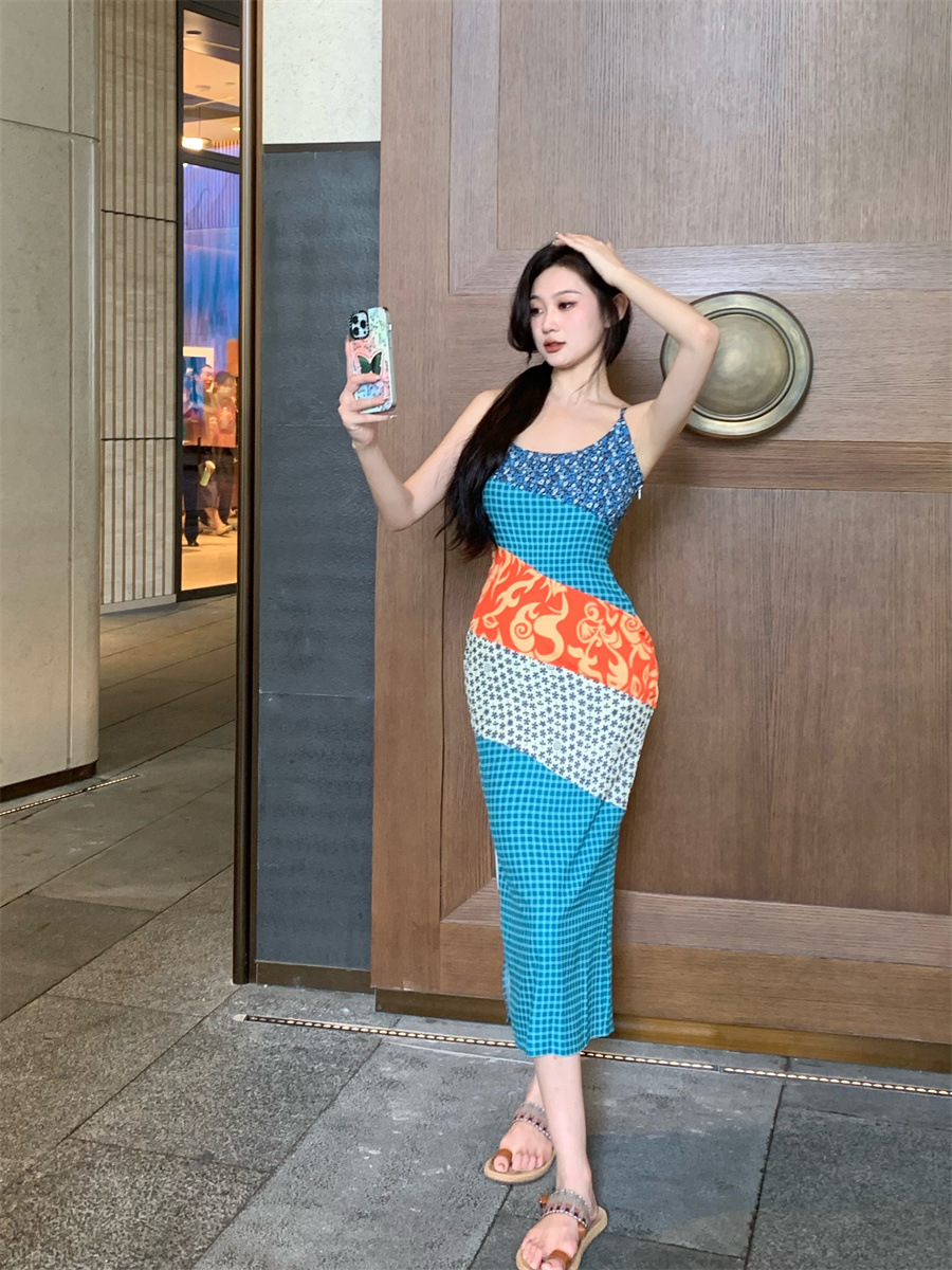 复古拼接碎花吊带连衣裙修身显瘦包臀气质夏季新款开叉长裙