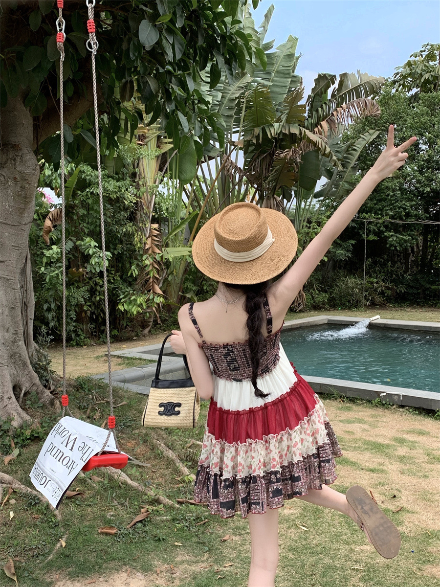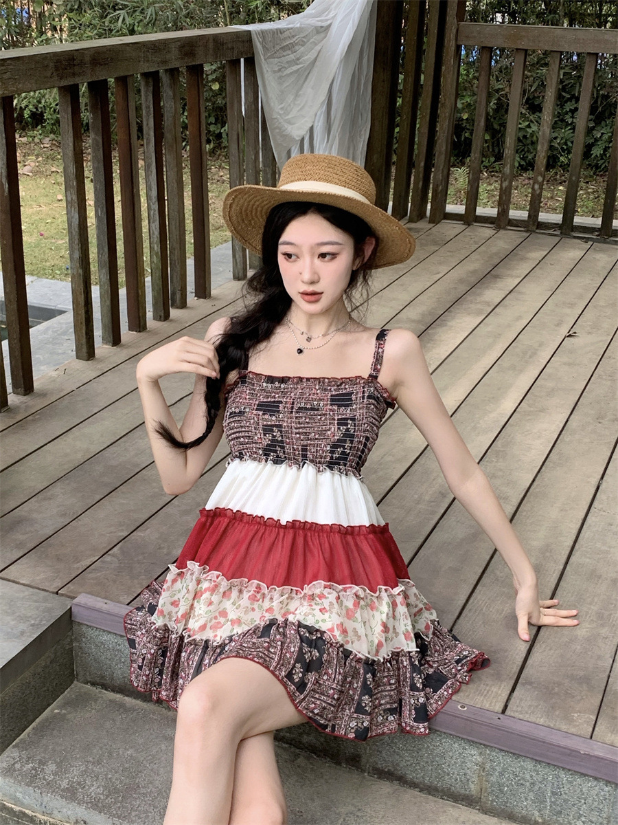 夏季气质复古撞色拼接碎花显瘦高腰吊带度假连衣短裙