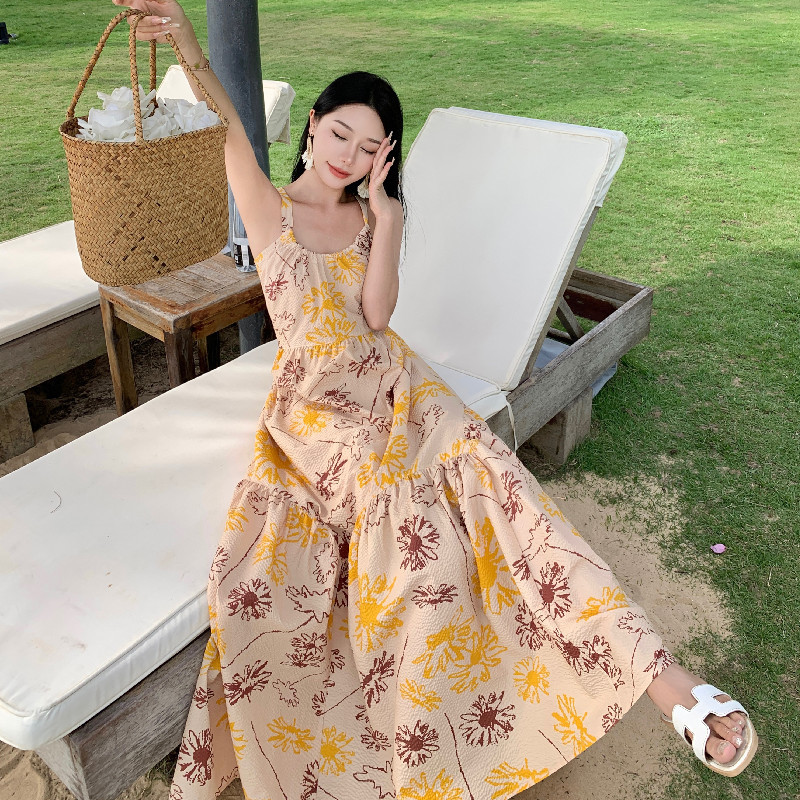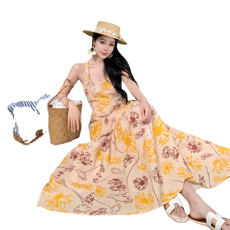 印花吊带露背蝴蝶结连衣裙百搭大裙摆长款裙子