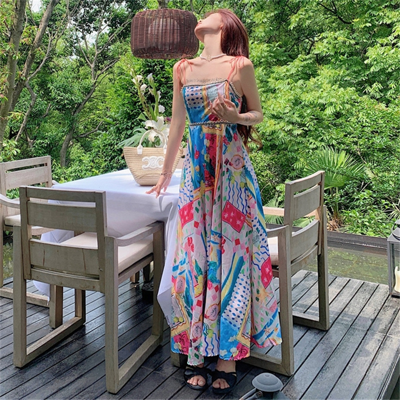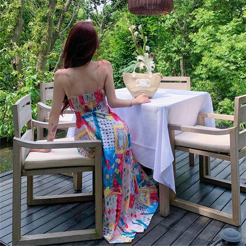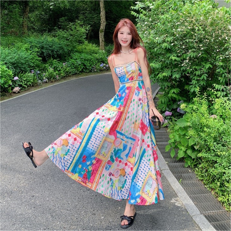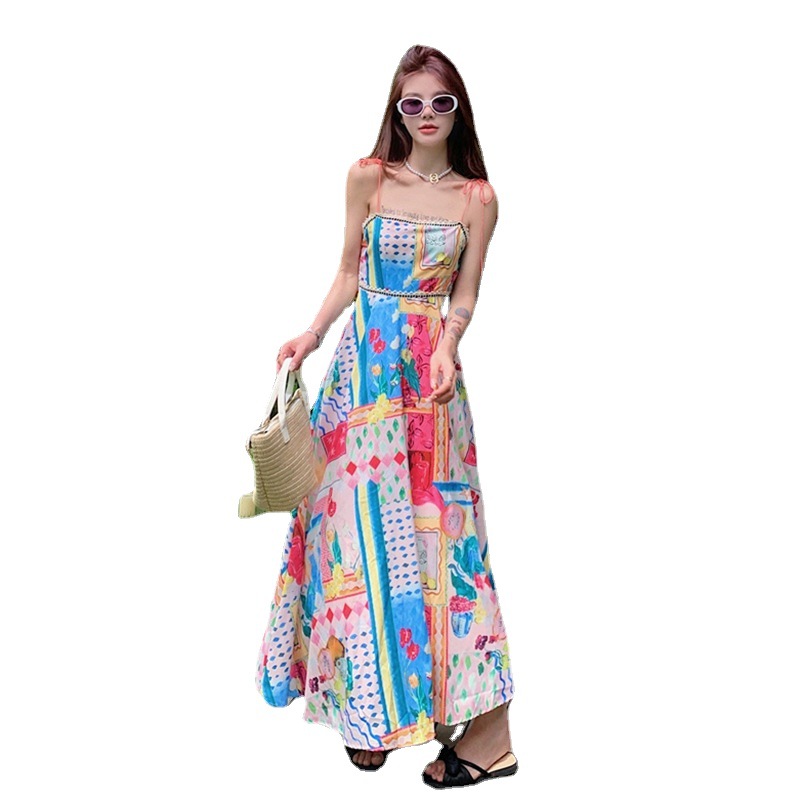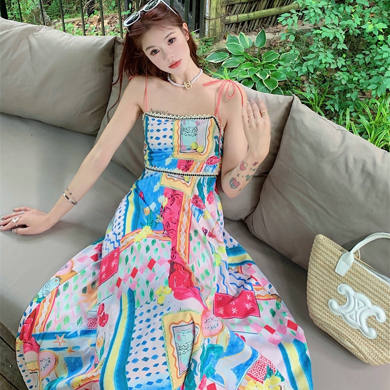 桔梗法式甜美显瘦海边度假遮肚子减龄印花油画风吊带连衣裙女夏季