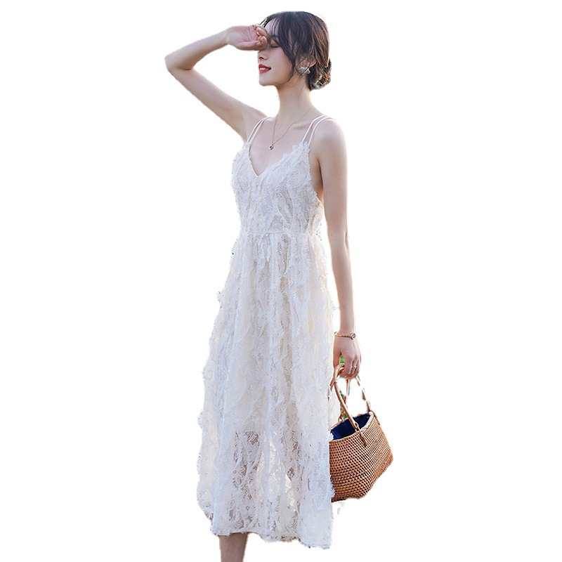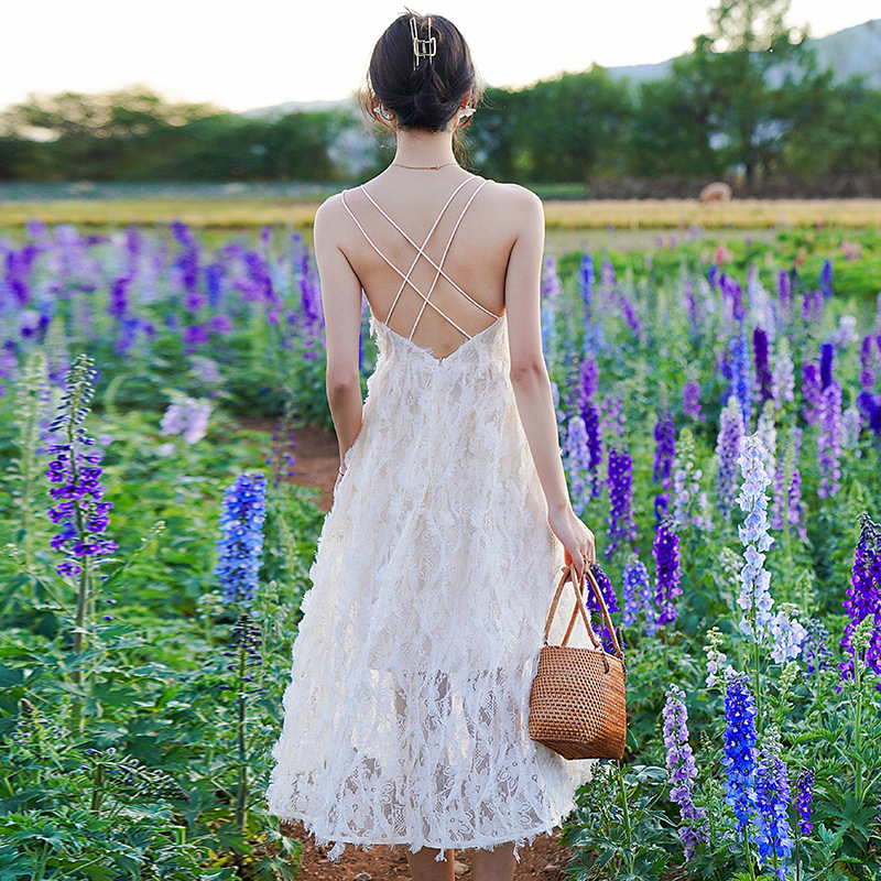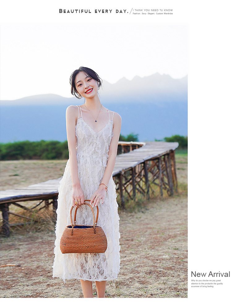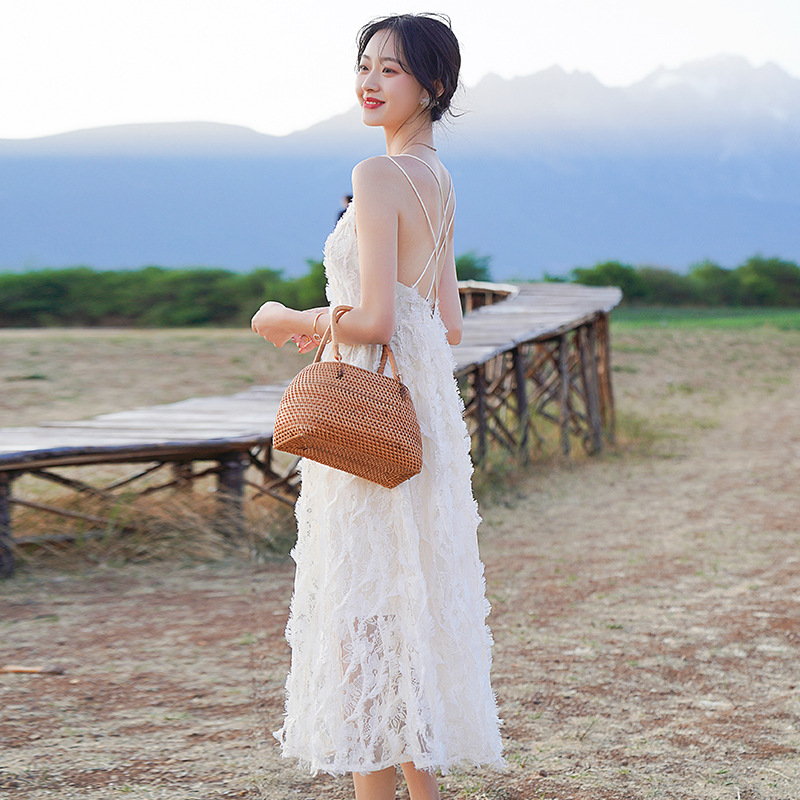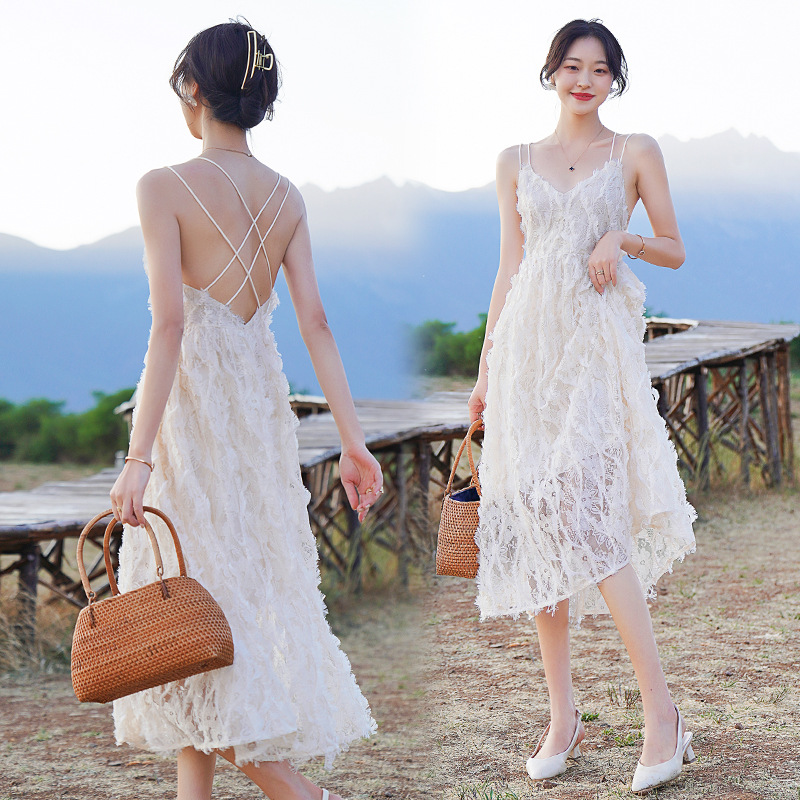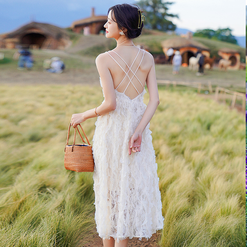 海边度假沙滩裙流苏羽毛吊带露背显瘦中长款连衣裙女