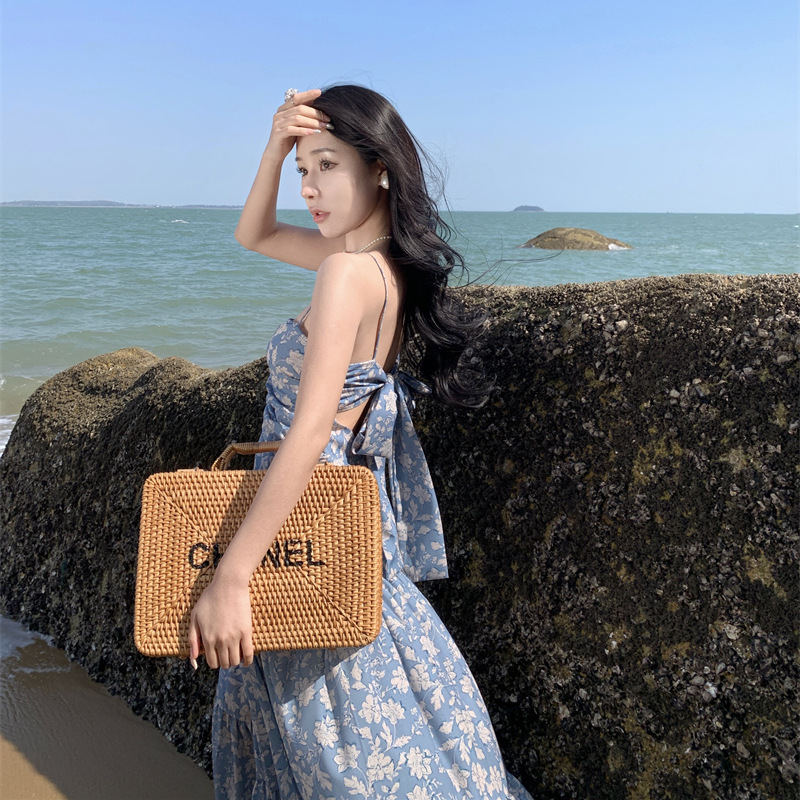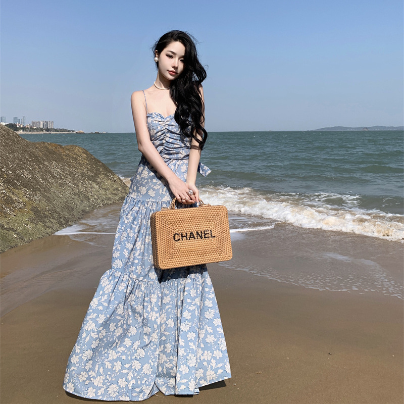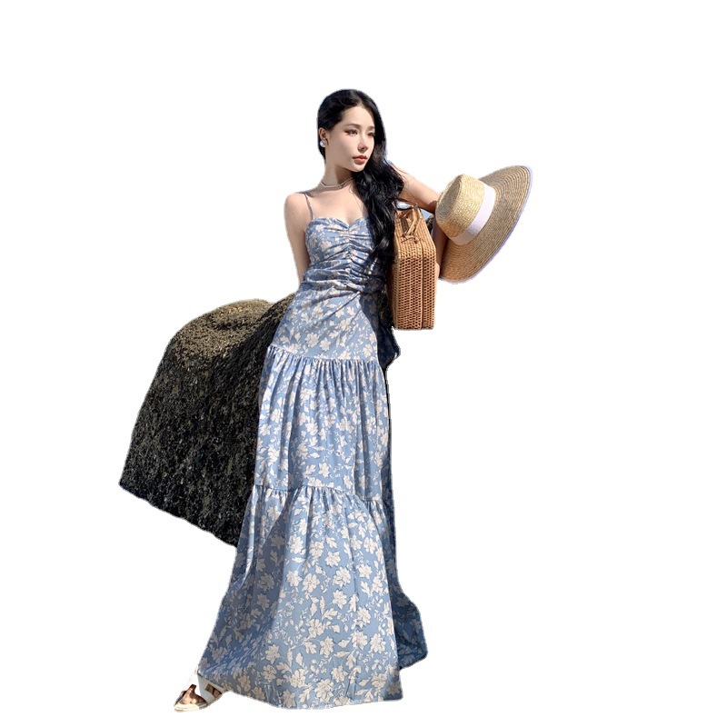 露背吊带裙女法式复古碎花一字肩褶皱连衣裙海边度假沙滩裙