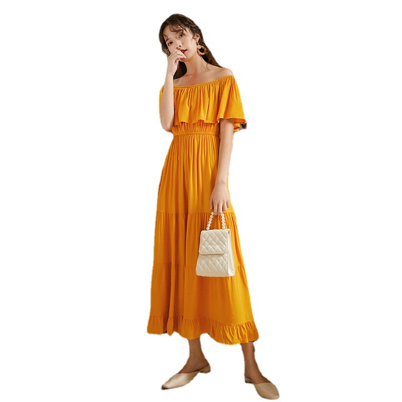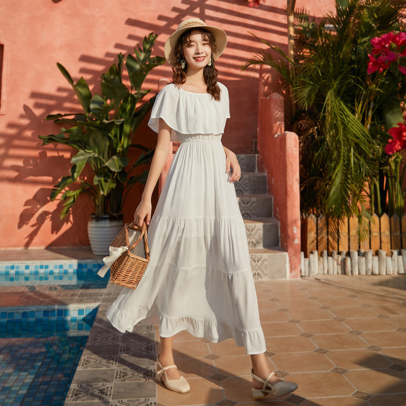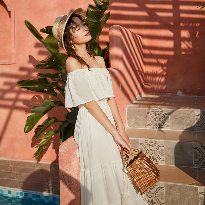 女夏新款泰国海岛度假风露肩抹胸连衣裙一字领沙滩长裙超仙女