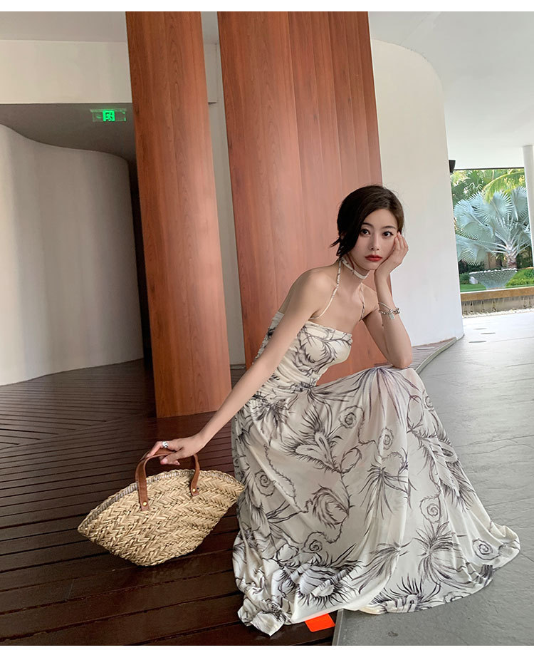茶歇法式沙滩度假连衣裙女夏新款印花挂脖抹胸长裙子女