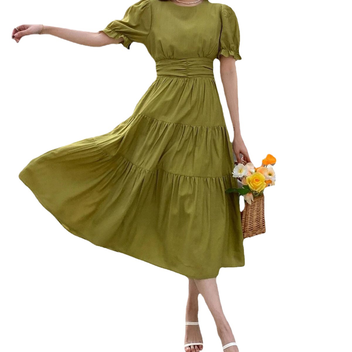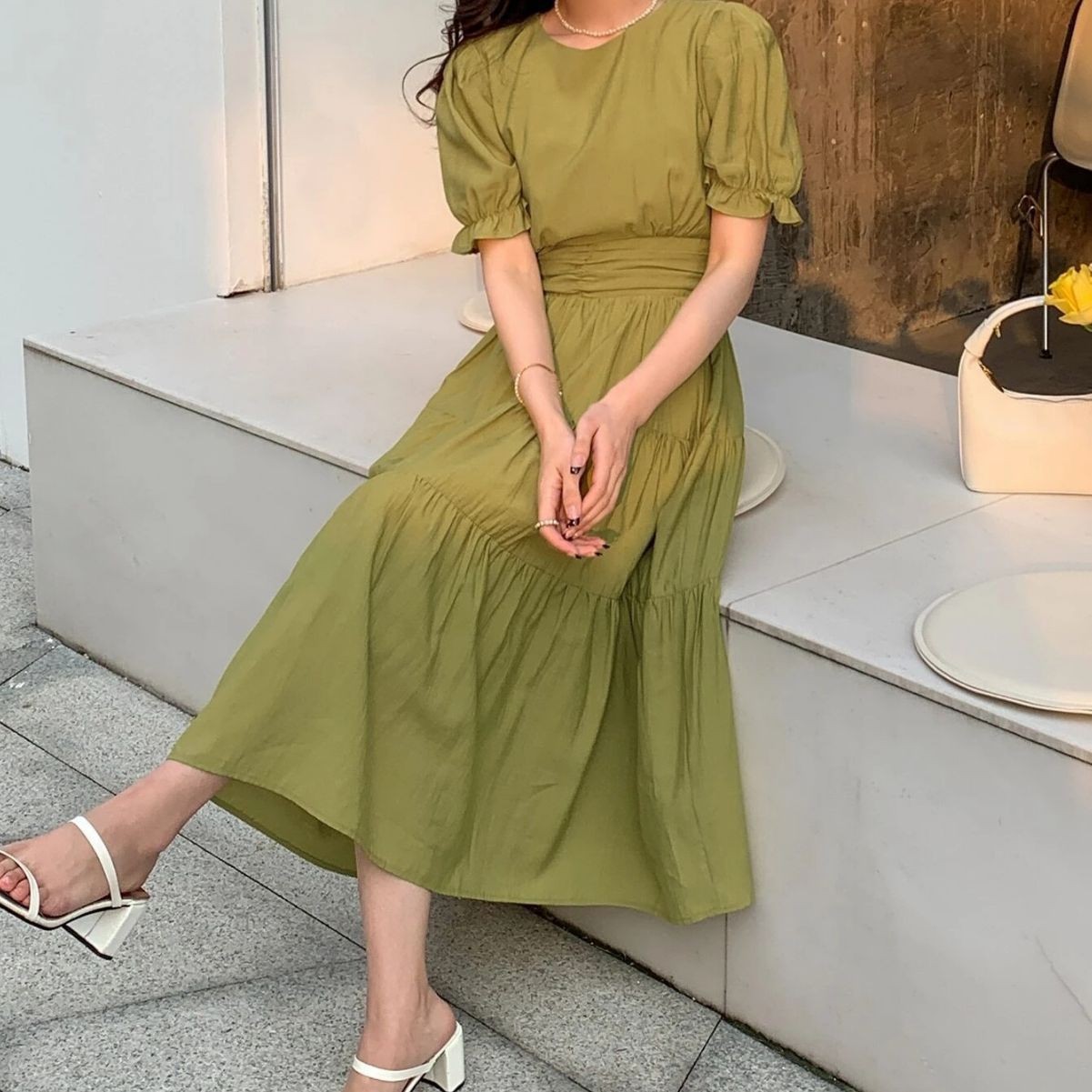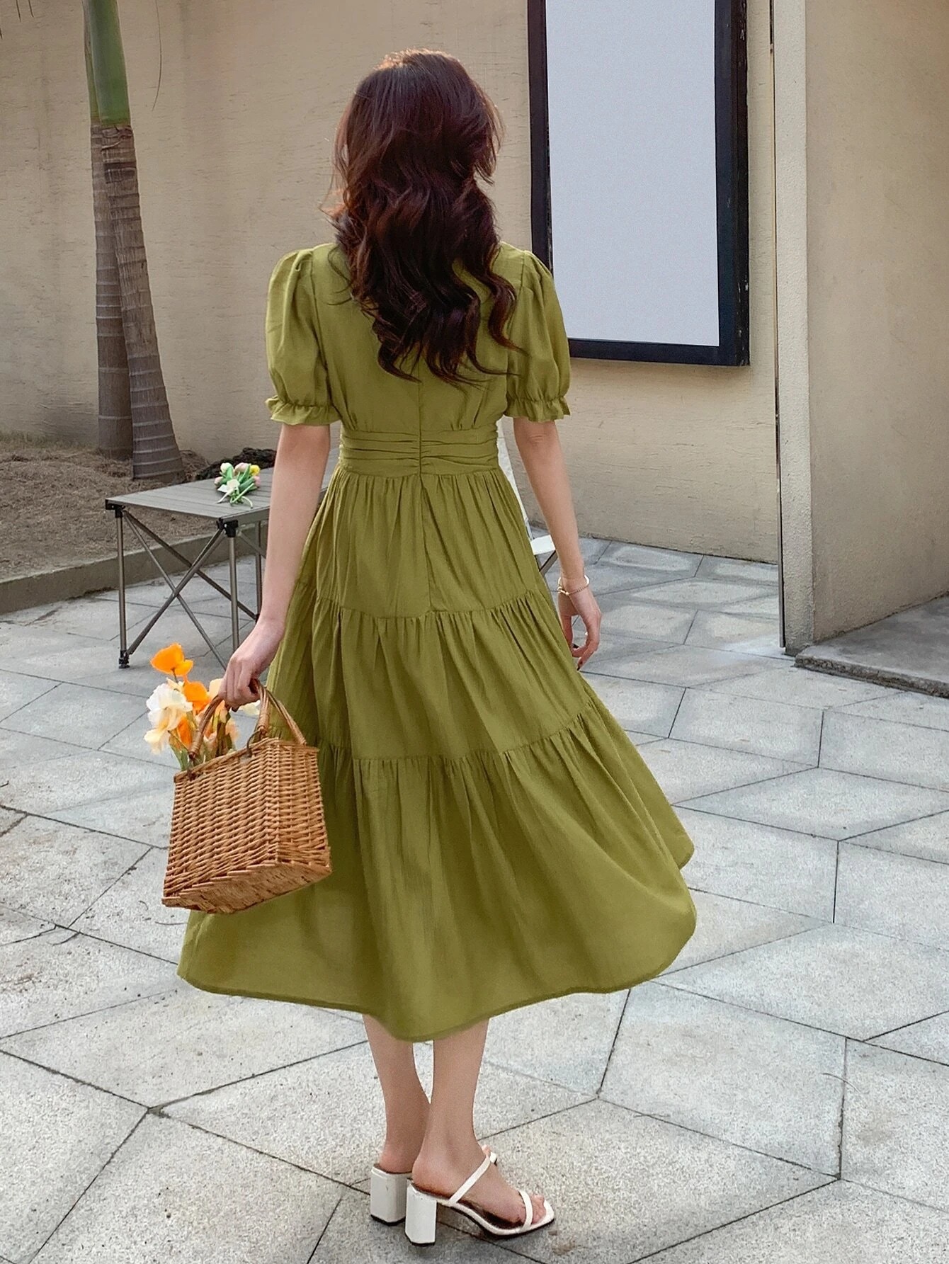 绿色温柔风气质泡泡袖连衣裙女夏季新款法式赫本压褶收腰显瘦裙子