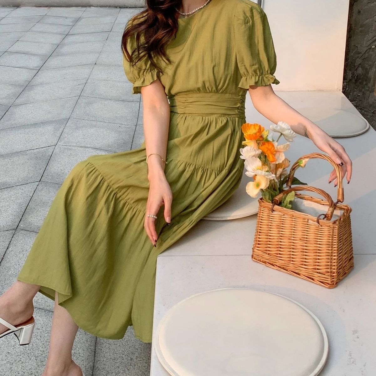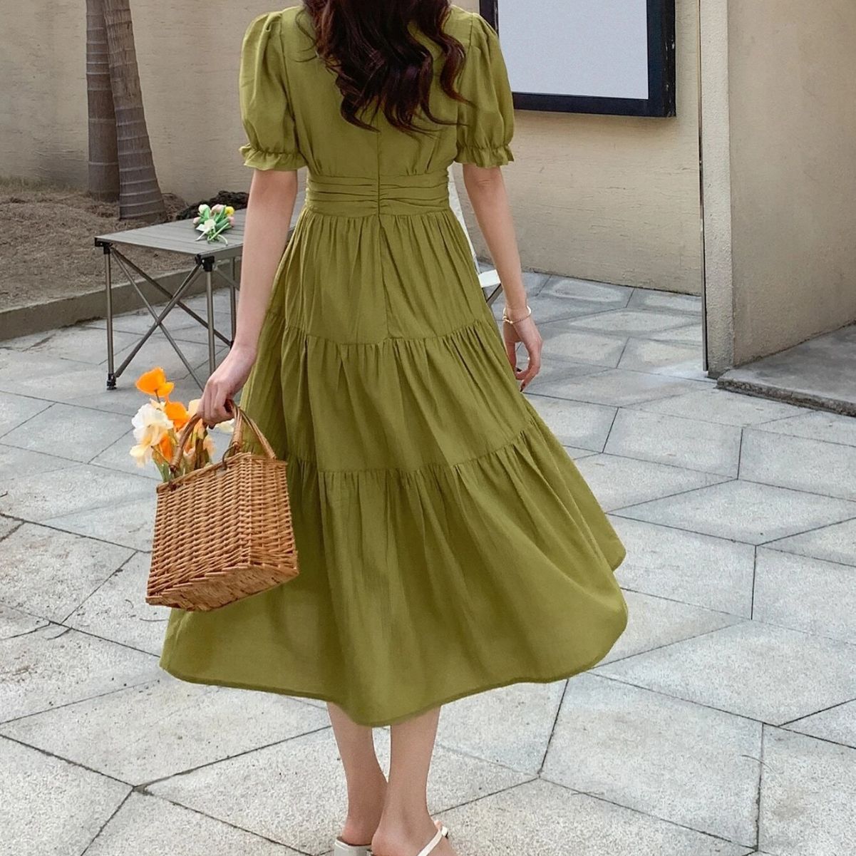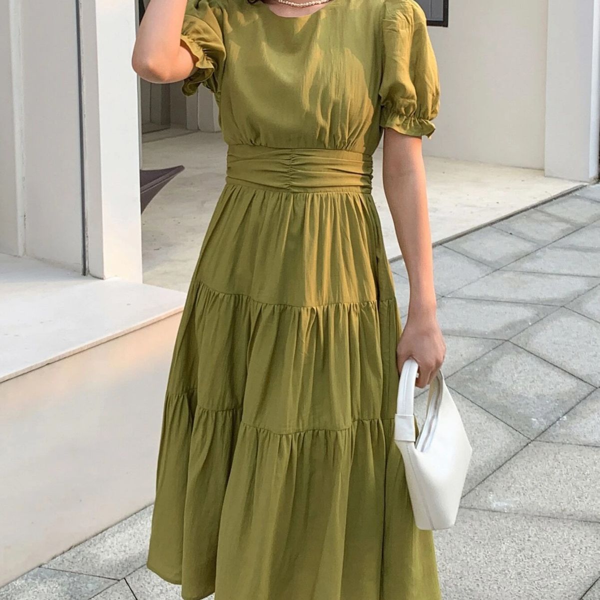 绿色温柔风气质泡泡袖连衣裙女夏季新款法式赫本压褶收腰显瘦裙子