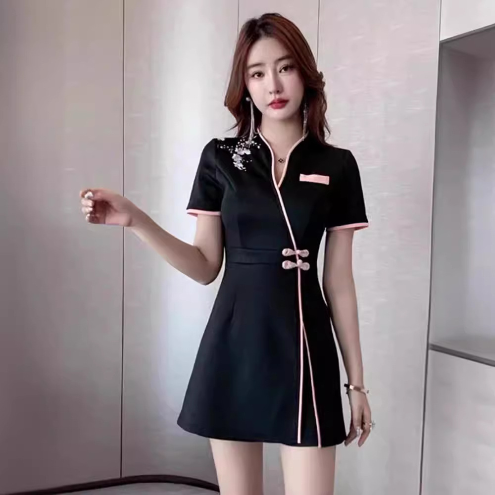美容院美甲师工作服女养生馆夏季国潮风性感两件套连衣裙套装大码