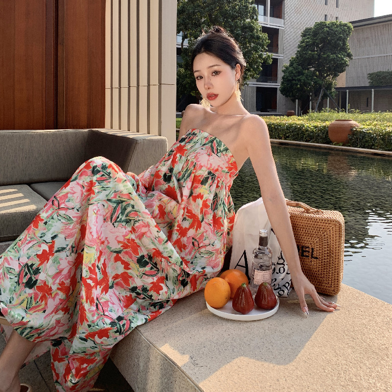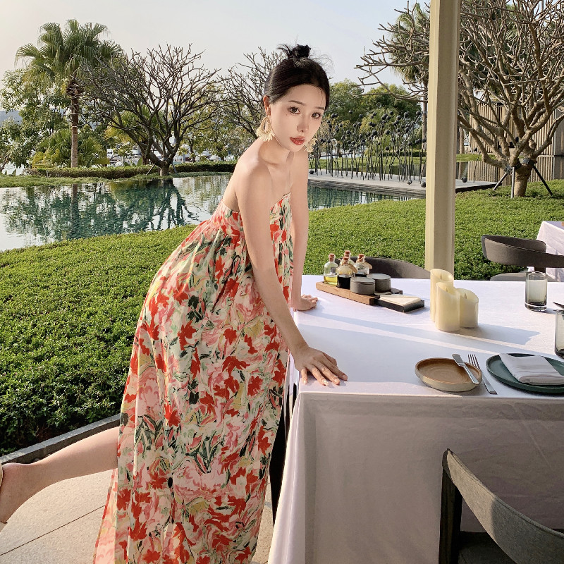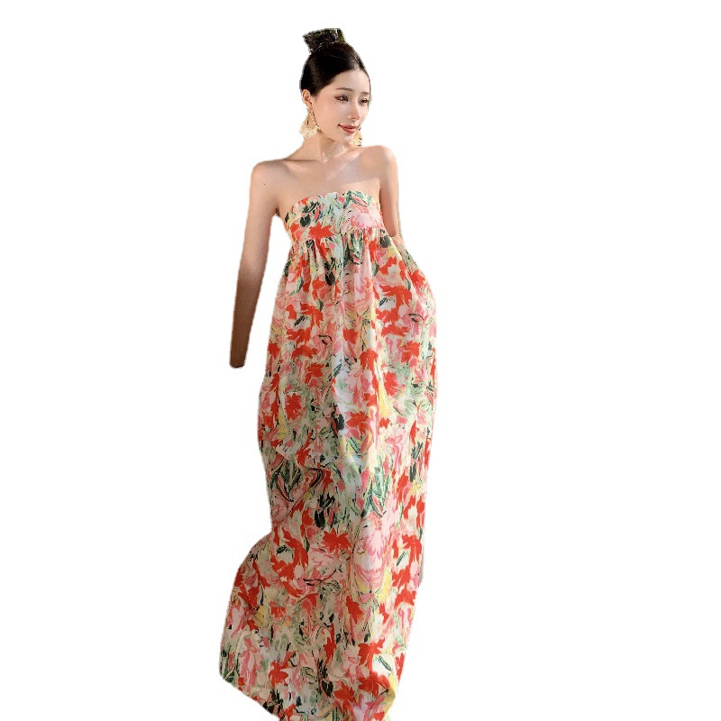 花卉油画感印花抹胸花苞海边度假连衣裙高级感三亚超仙氛围沙滩裙