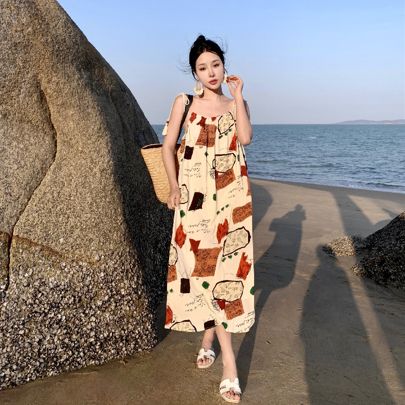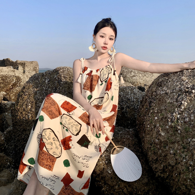 波西米亚海边度假连衣裙沙滩裙女夏高级感泰式印花吊带裙长裙女