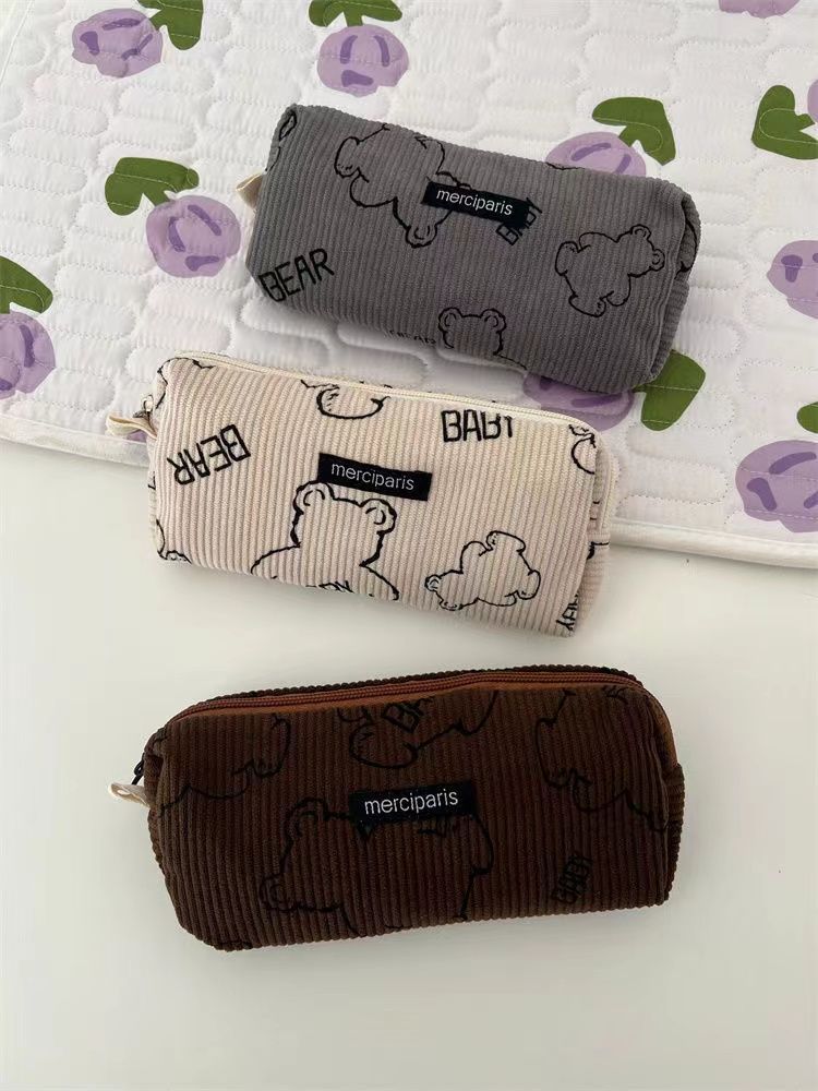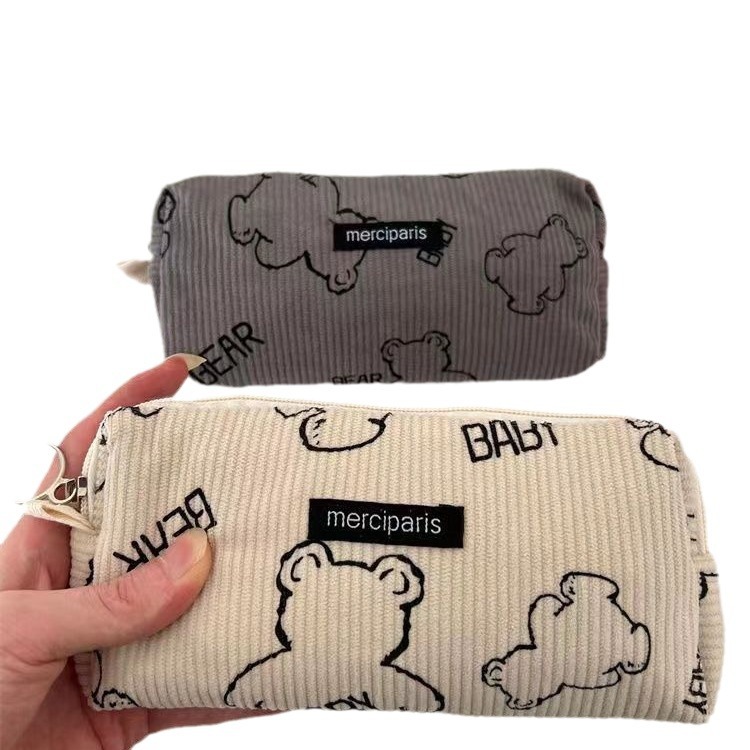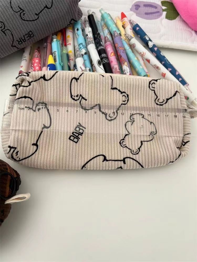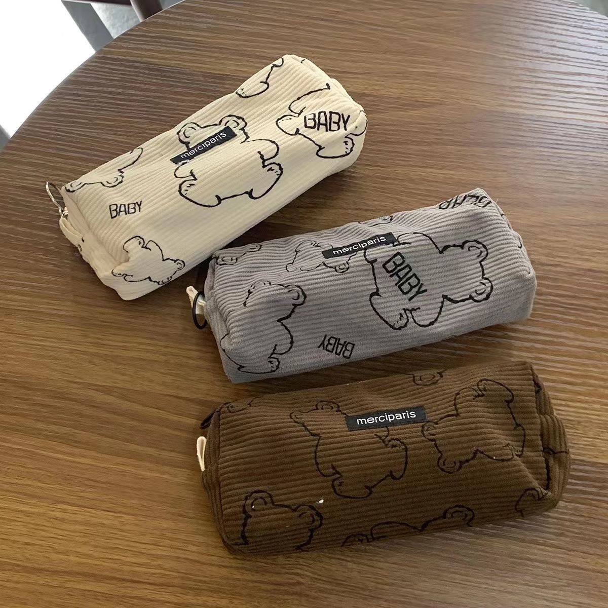 印花小熊灯芯绒帆布笔袋ins日系可爱学生简约大容量文具盒铅笔袋