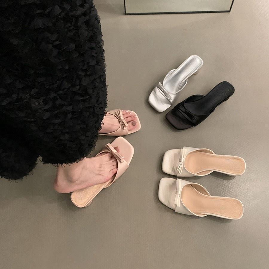 法式凉拖蝴蝶结一字拖鞋夏季新款仙女鞋子外穿气质粗跟凉鞋女
