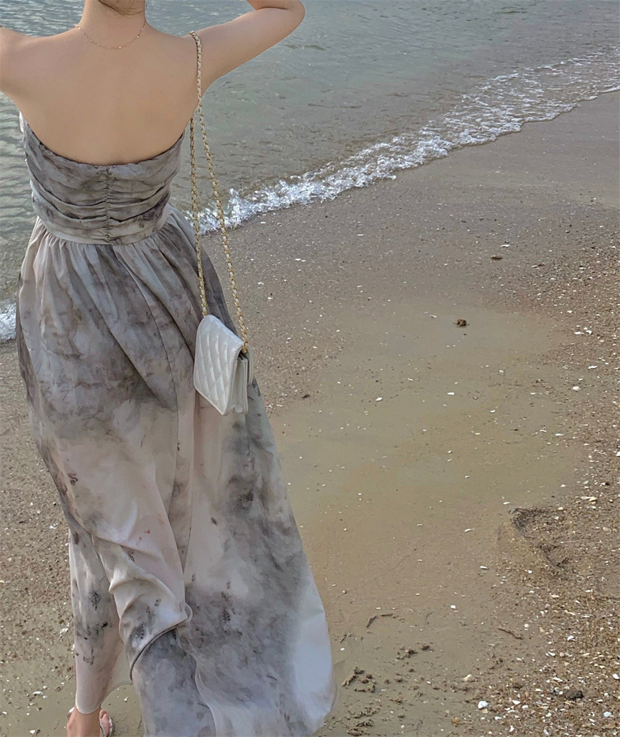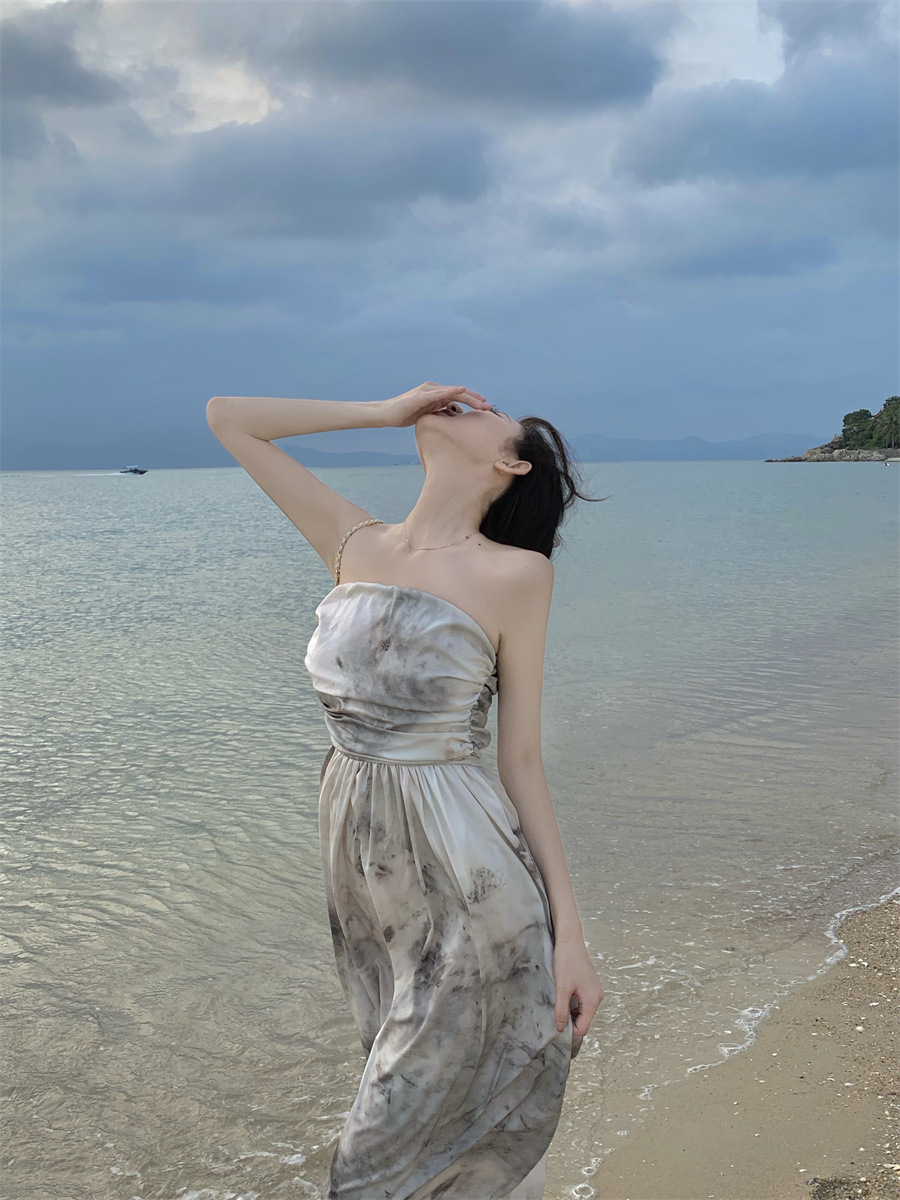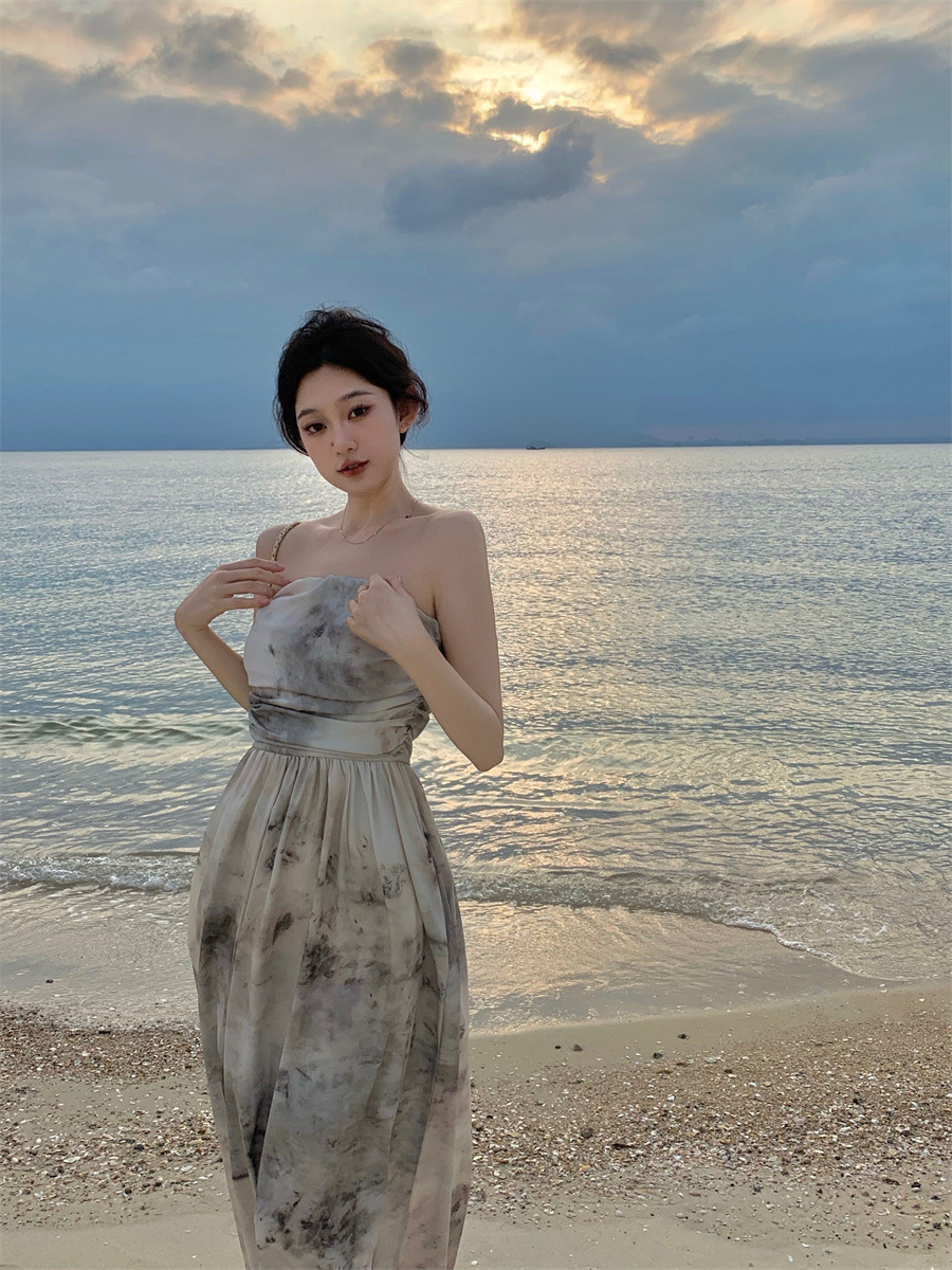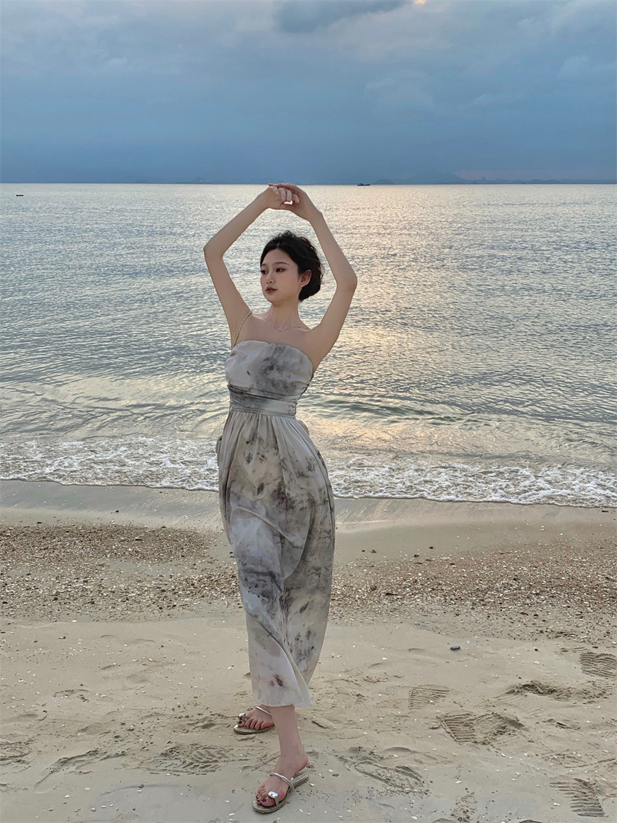 复古新中式印花抹胸度假连衣裙女夏季新款设计感扎染长裙子女
