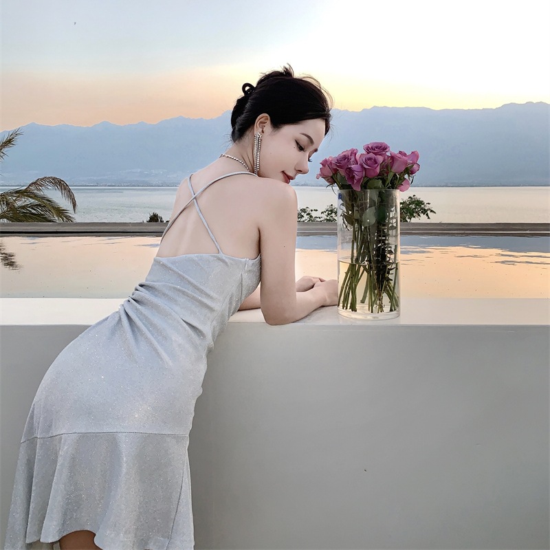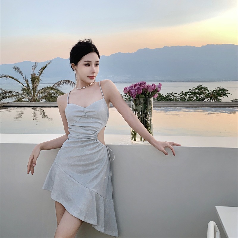 夏季性感纯欲风光泽感亮片露背镂空抽绳不规则连衣裙短裙女