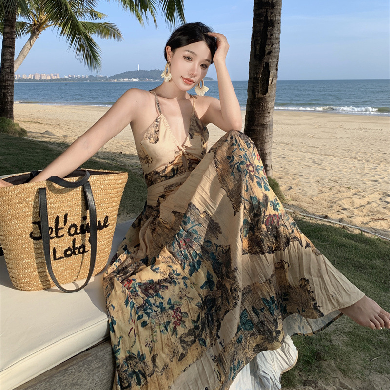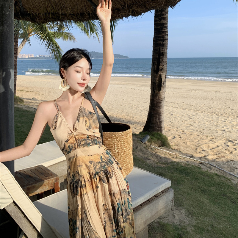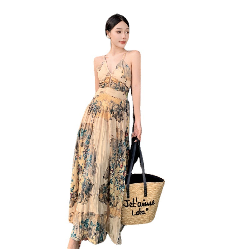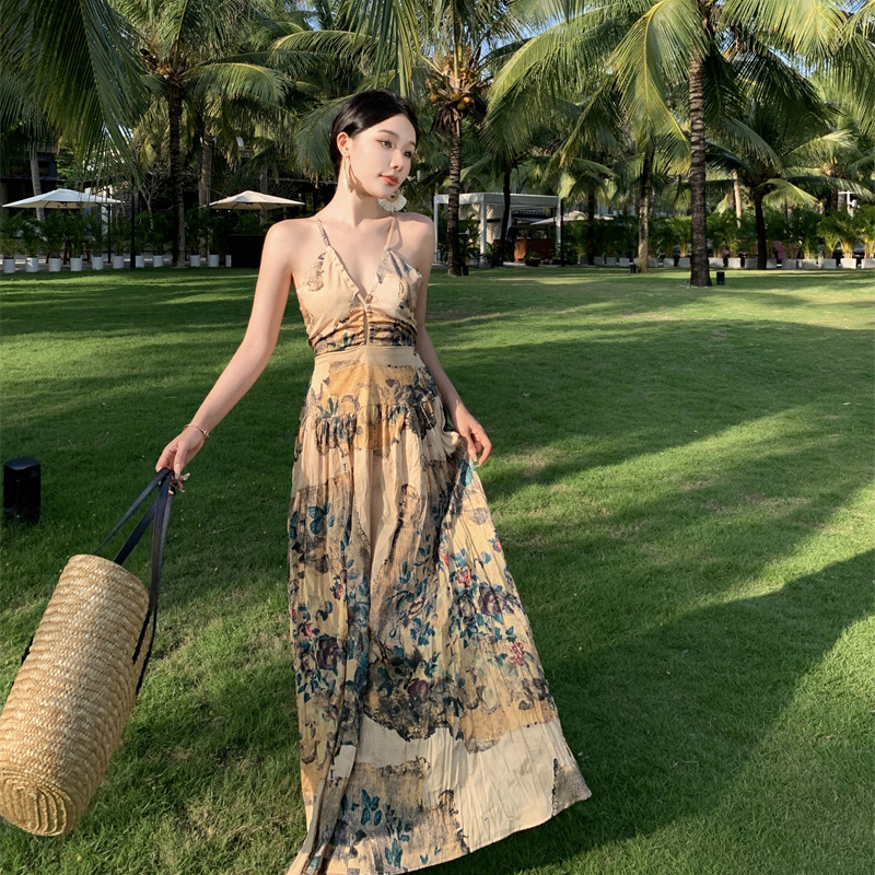 夏季欧式复古吊带连衣裙女V领小众后背镂空显瘦度假仙女裙春