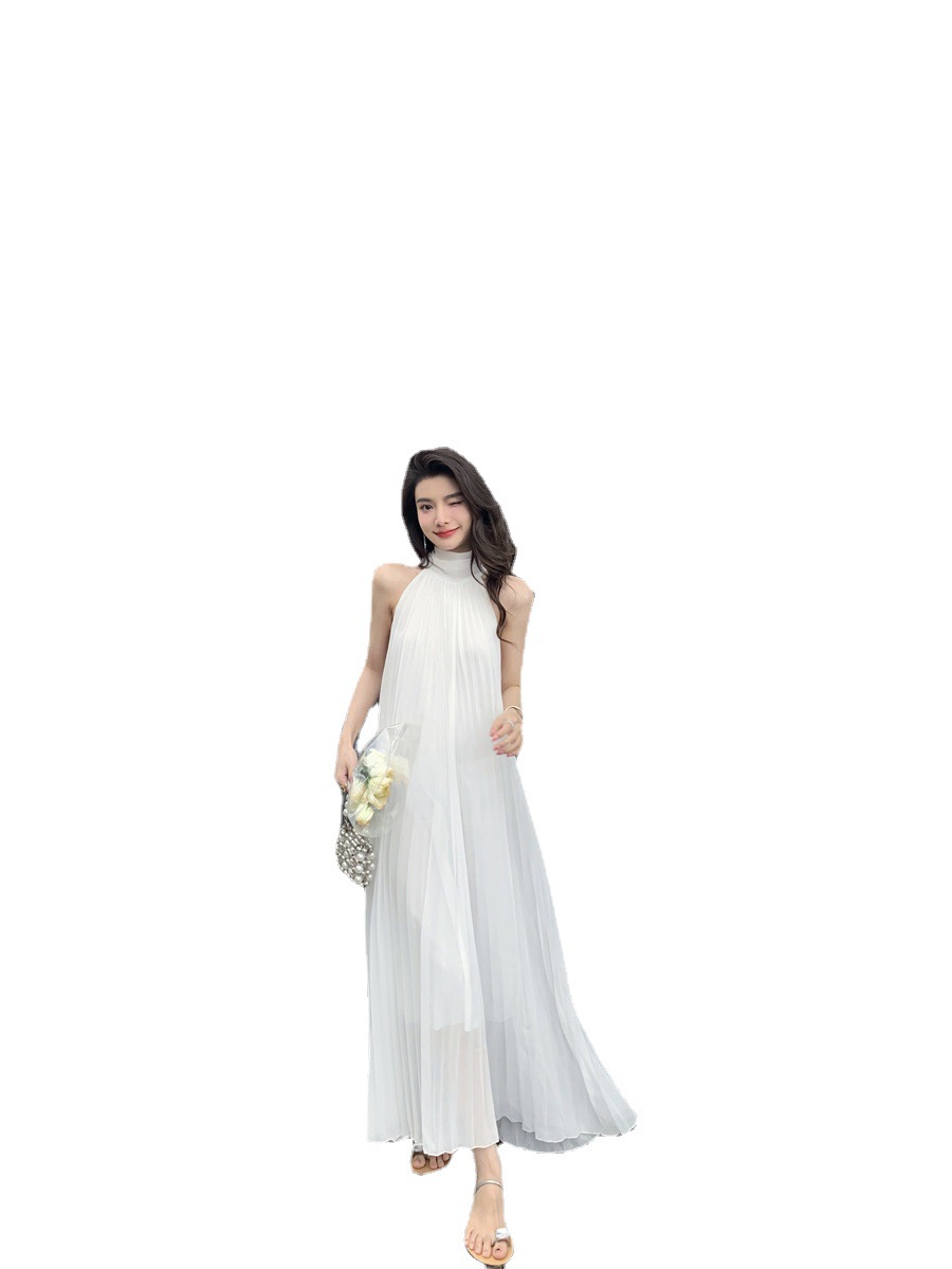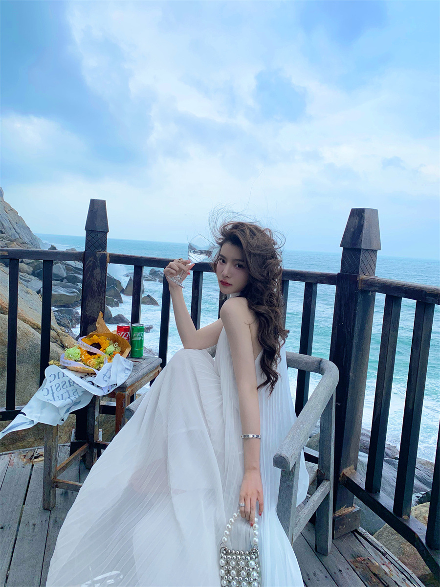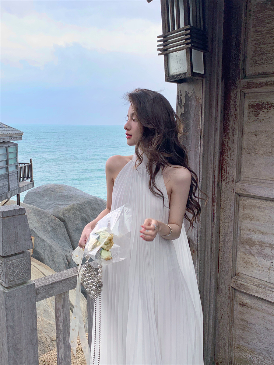 夏季新款 高级法式仙女度假百褶无袖大摆露肩连衣长裙女