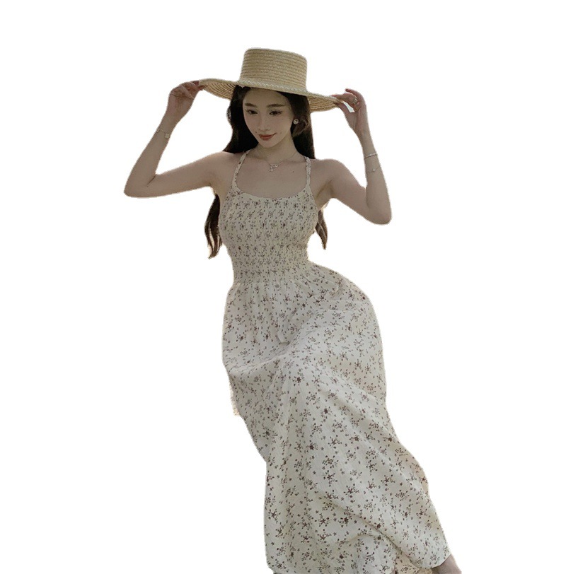 夏季新款女装法式复古黑色碎花吊带连衣裙淑女气质显瘦露背长裙子