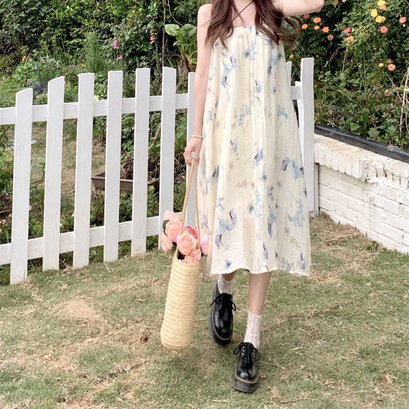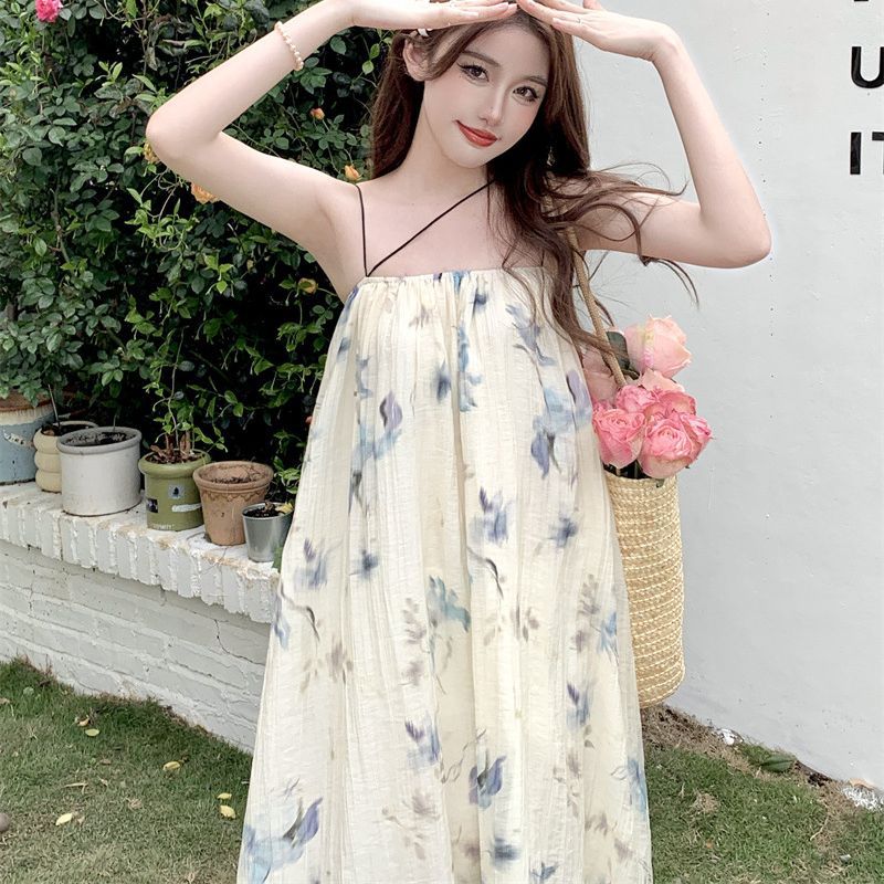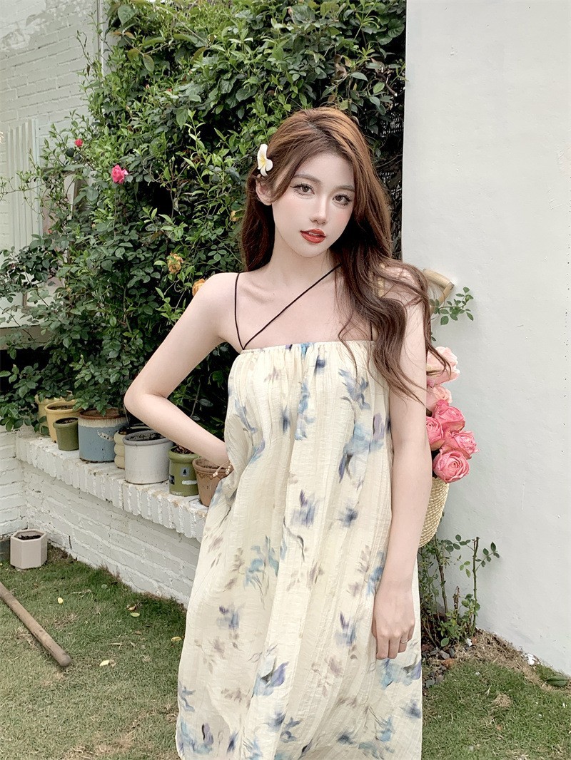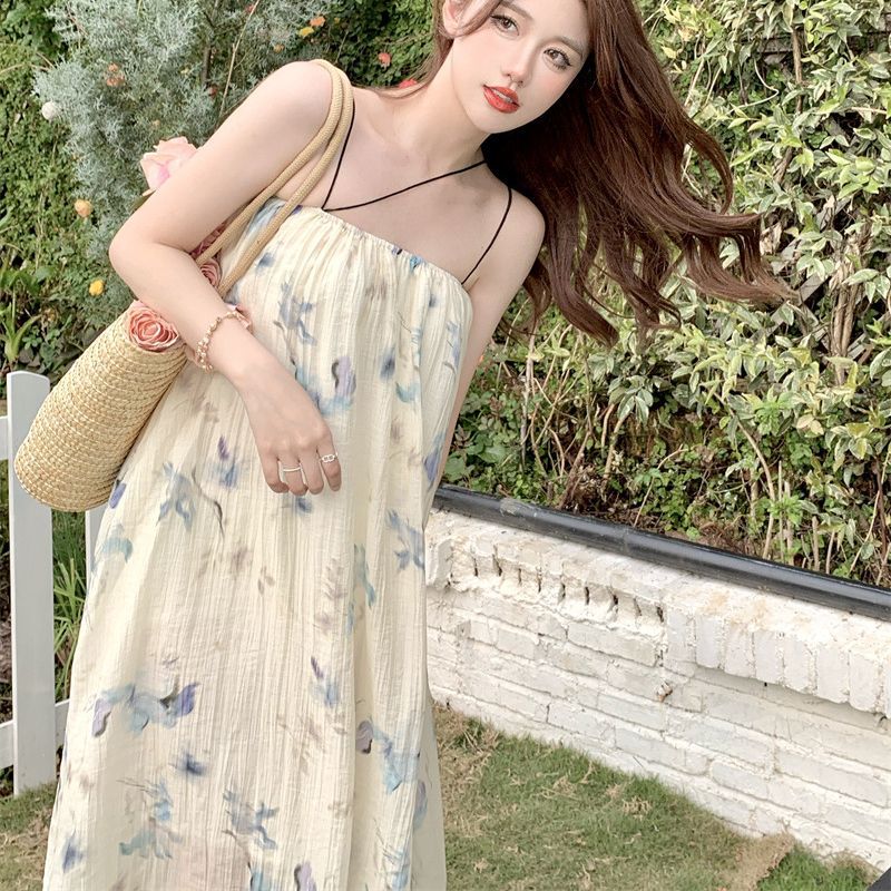 夏季女装奶油海盐油画蓝色吊带裙女夏度假风沙滩连衣裙长裙