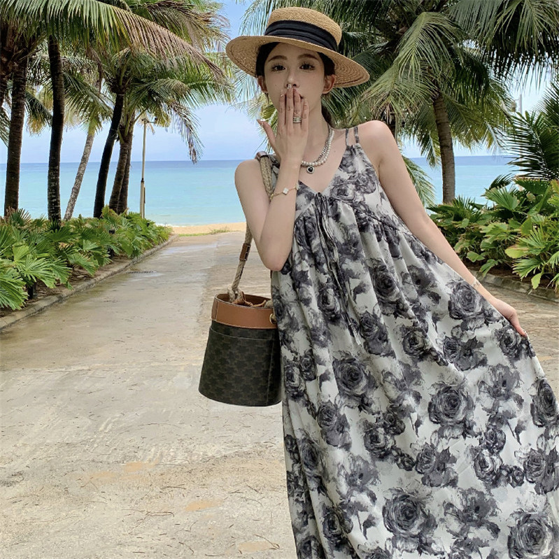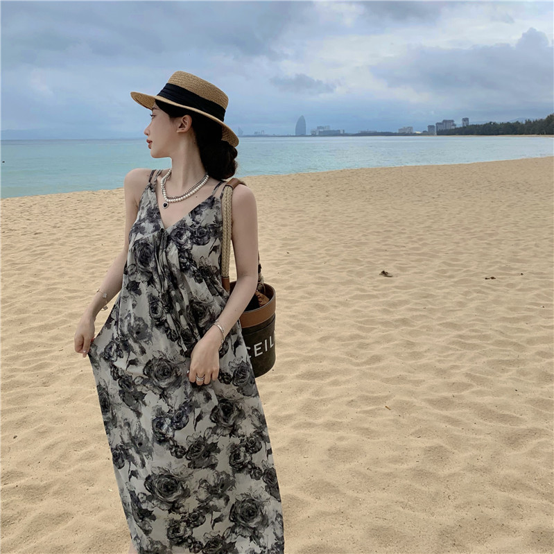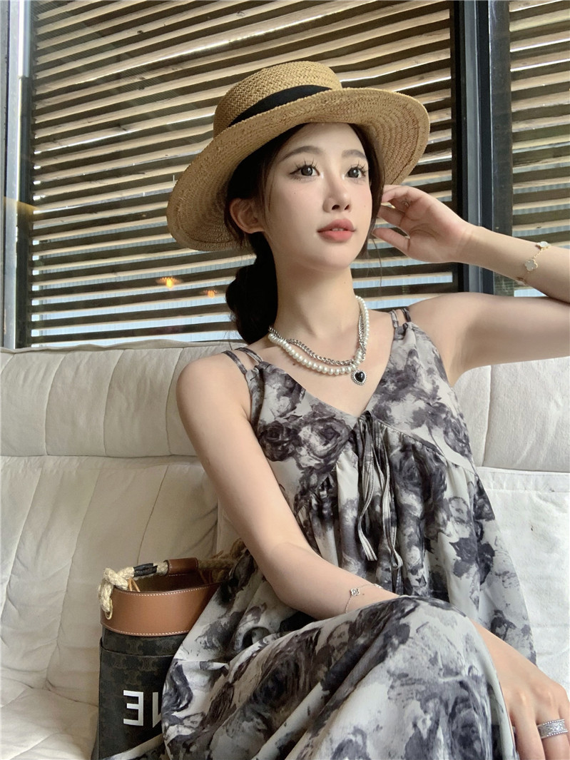 夏季吊带连衣裙女度假风收腰显瘦水墨印花长款v领雪纺裙子