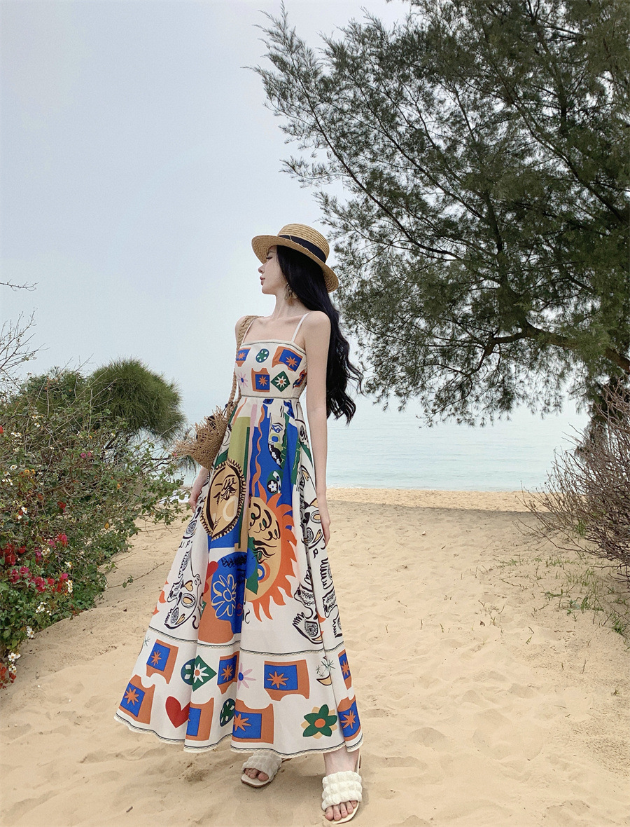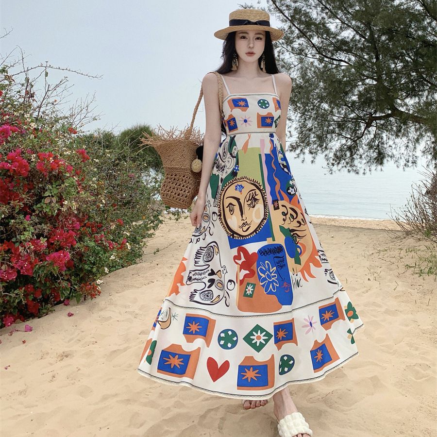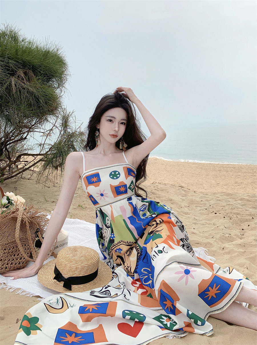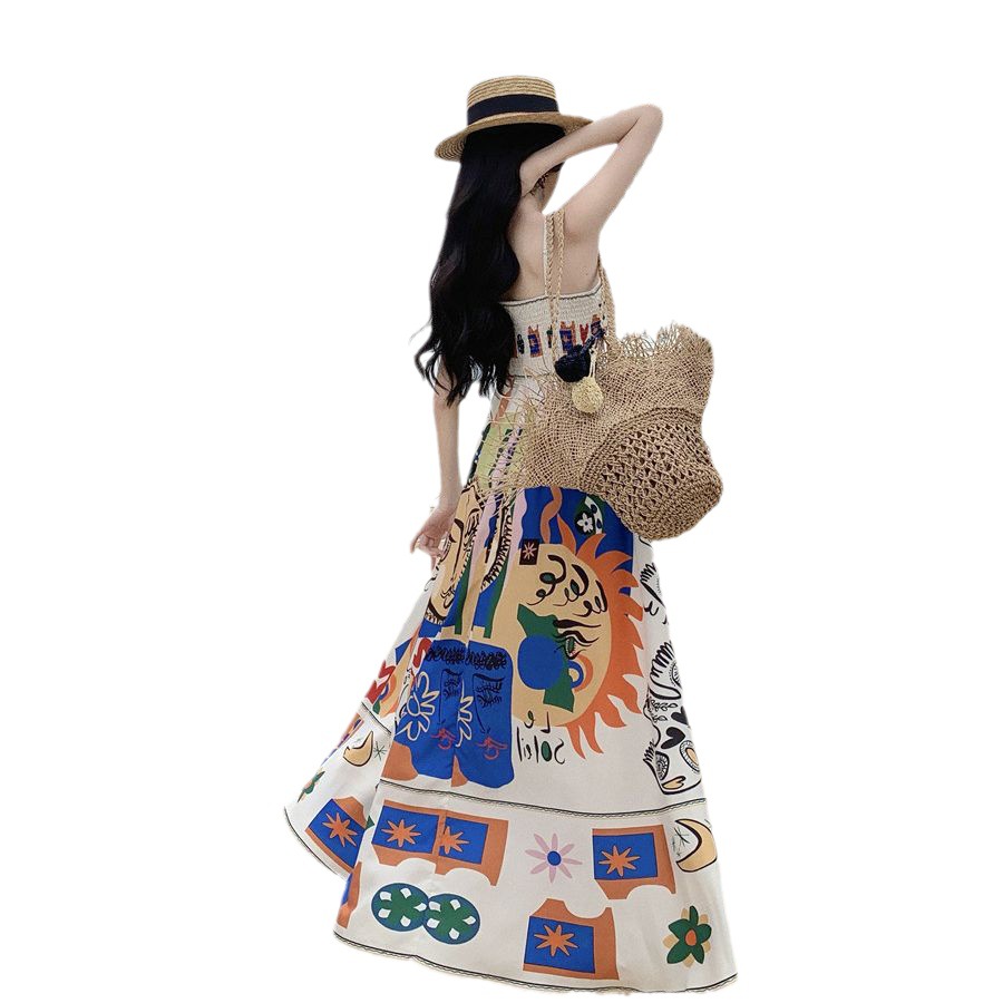 泰式彩色印花一字肩无袖沙滩长裙海边度假显瘦抹胸吊带连衣裙女夏