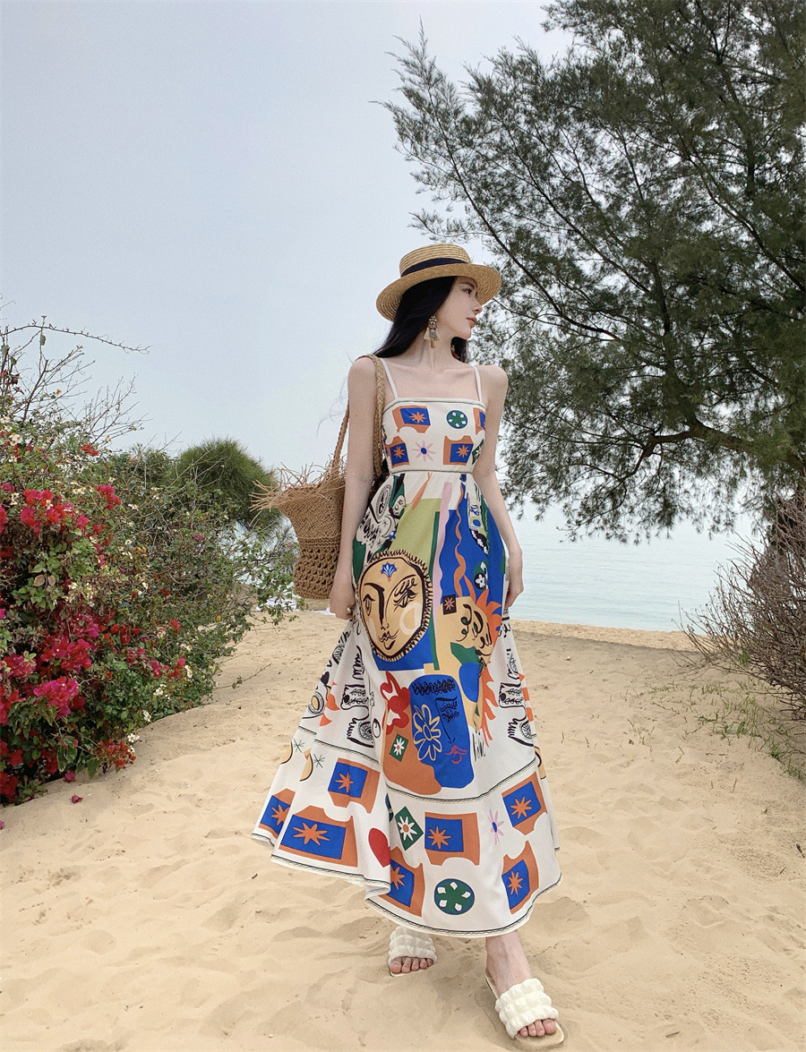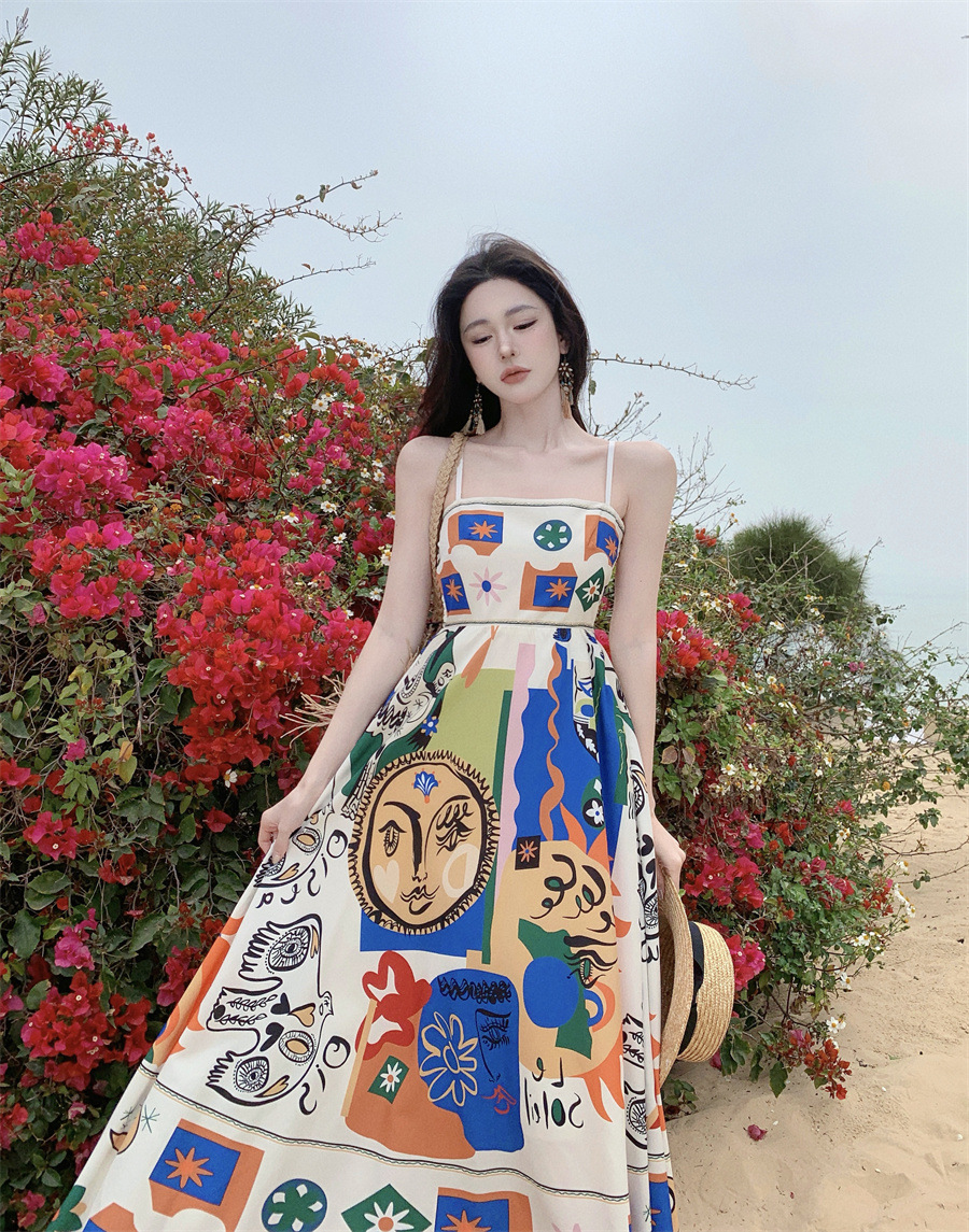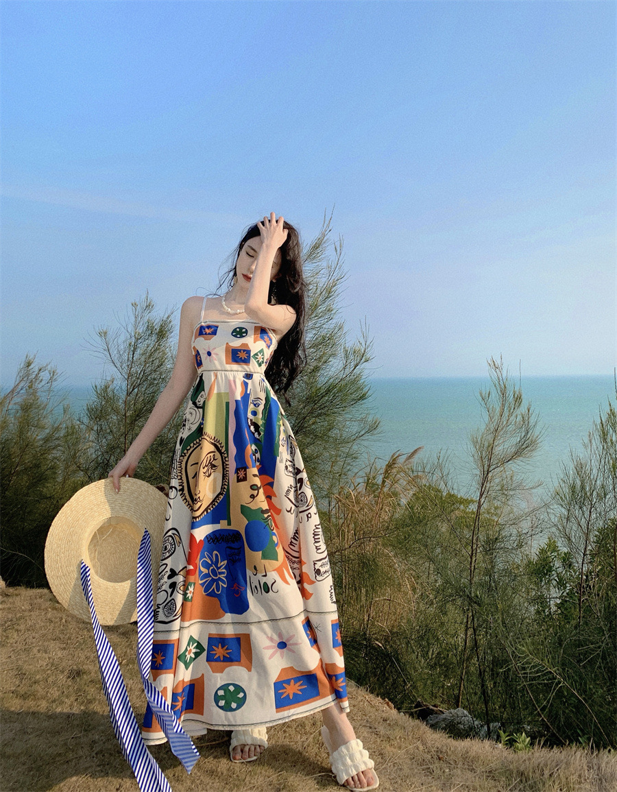 泰式彩色印花一字肩无袖沙滩长裙海边度假显瘦抹胸吊带连衣裙女夏