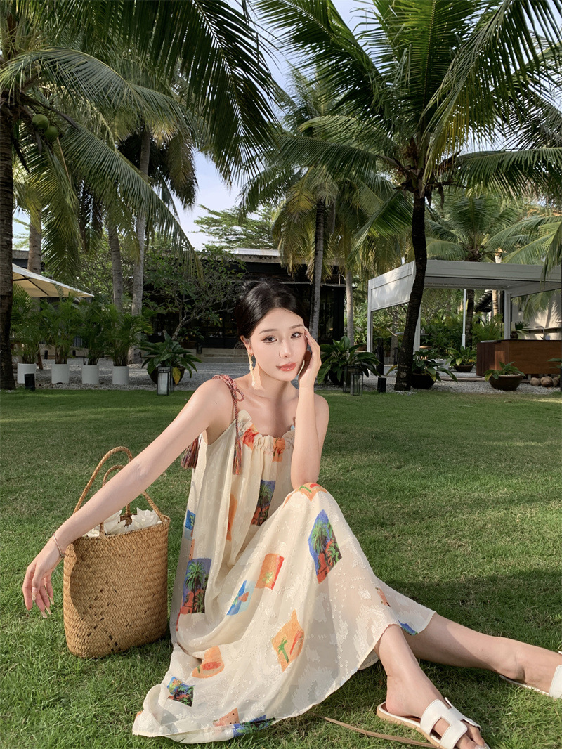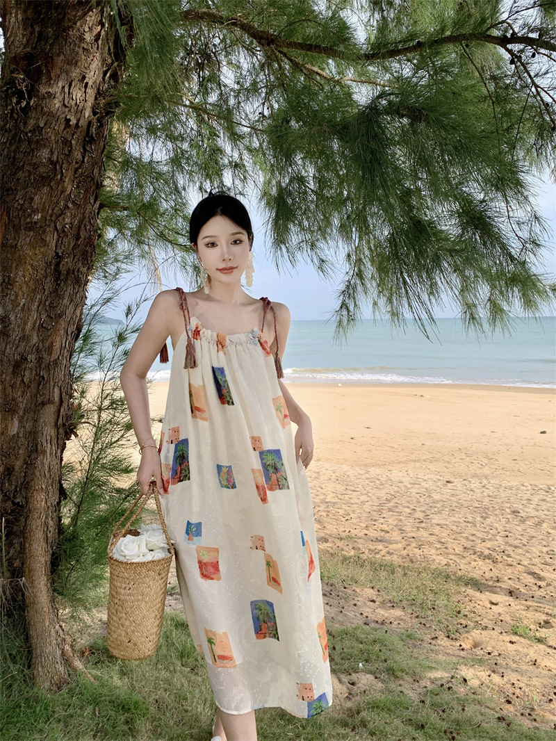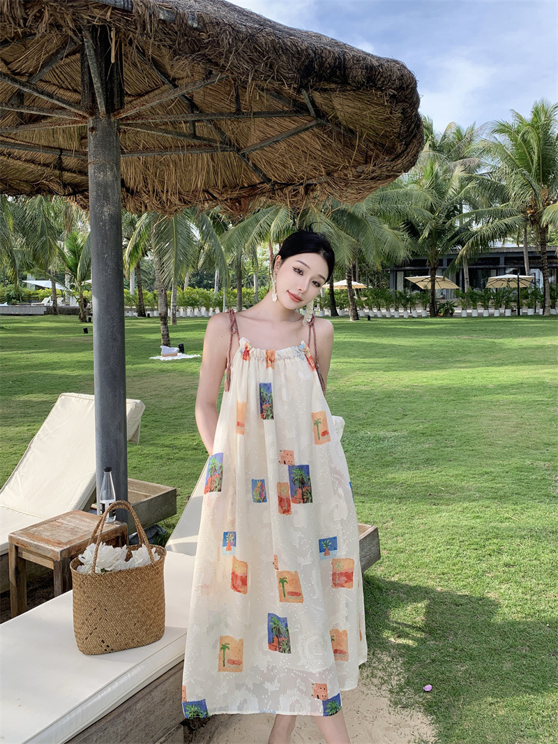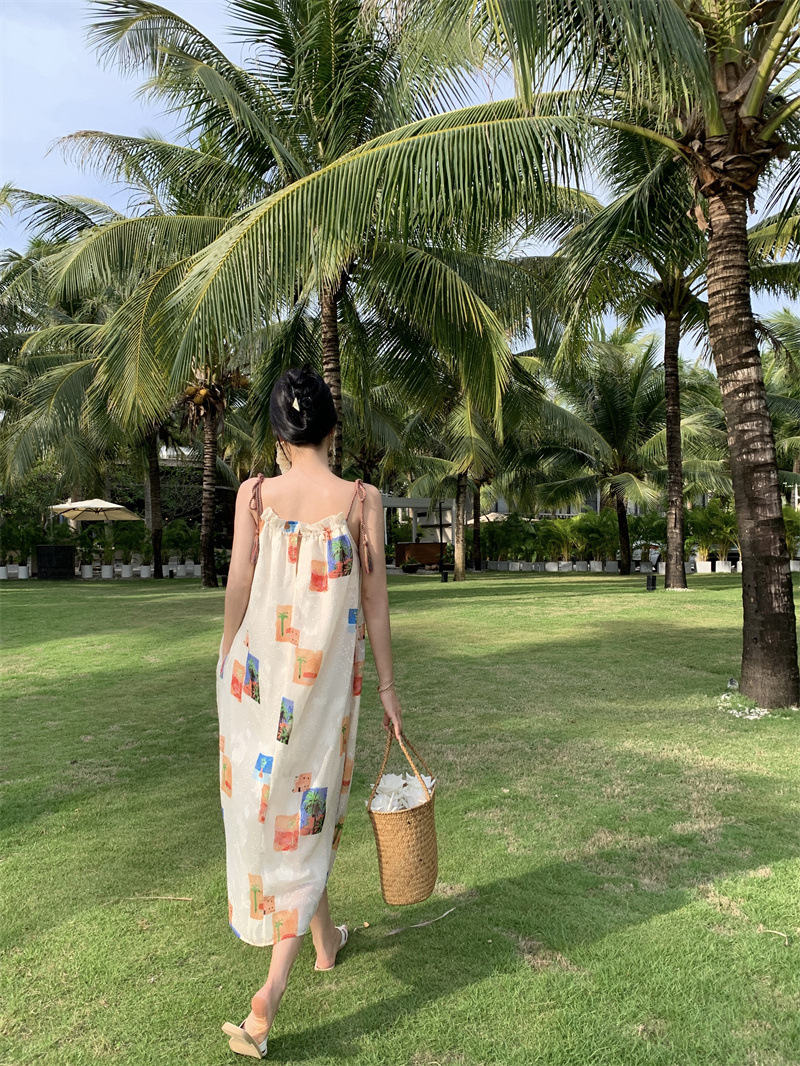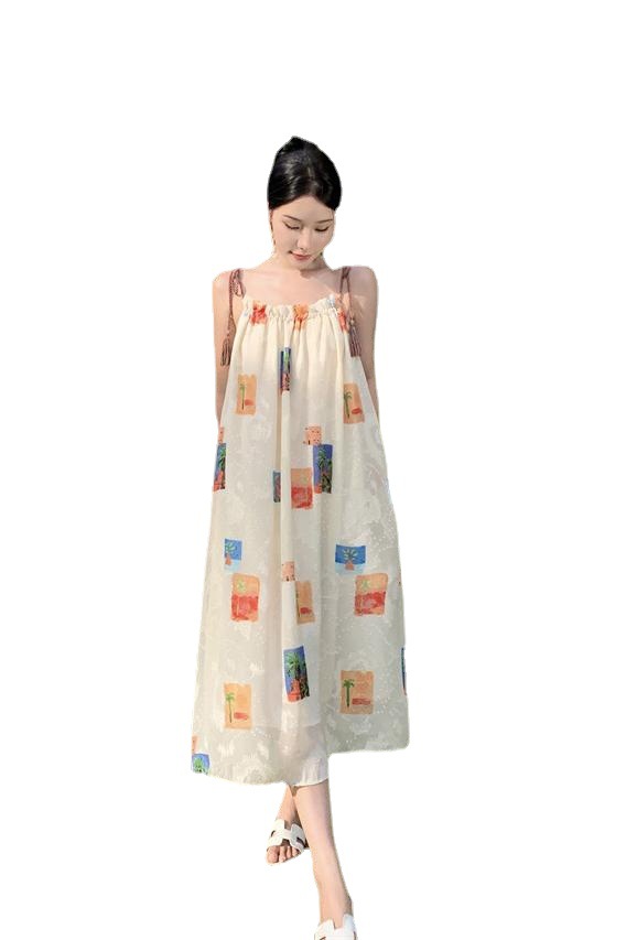 夏法式复古油画彩绘印花吊带裙海边度假沙滩裙宽松无袖连衣裙