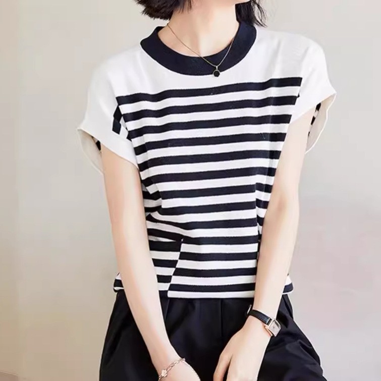 法式黑白条连袖针织海魂衫夏新品季海军风无袖气质冰丝上衣