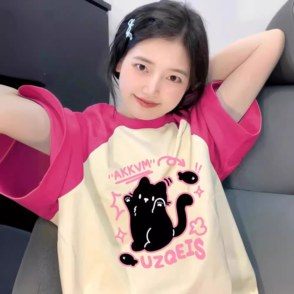 美式复古插肩纯棉短袖t恤女夏季休闲百搭大码宽松撞色设计感上衣