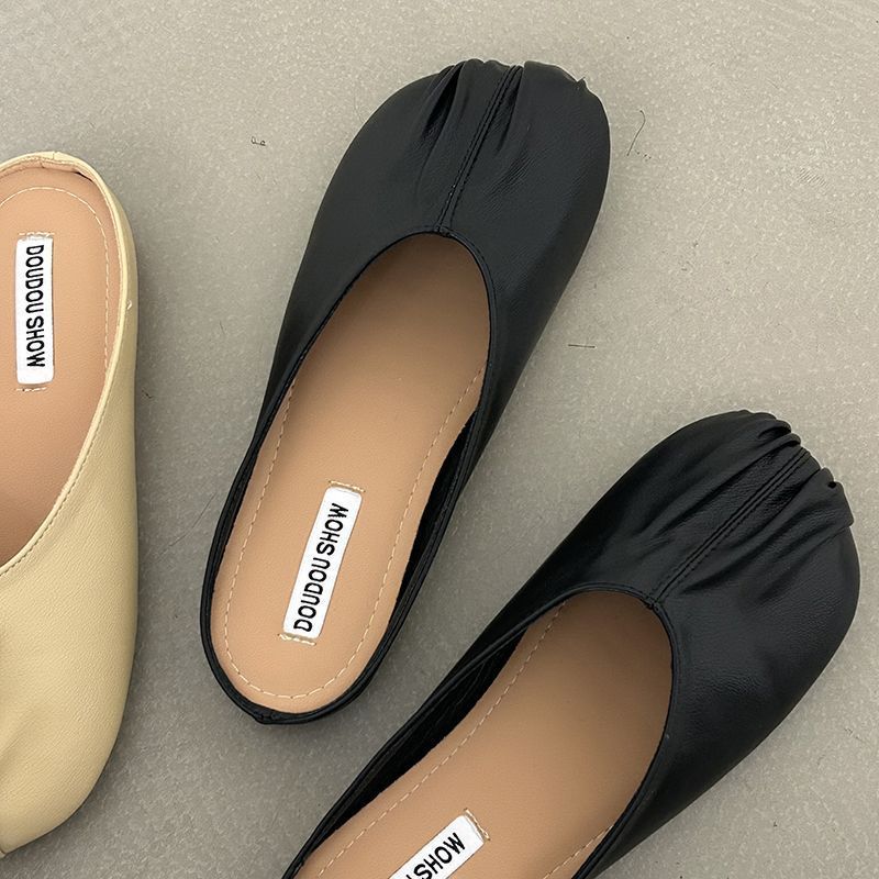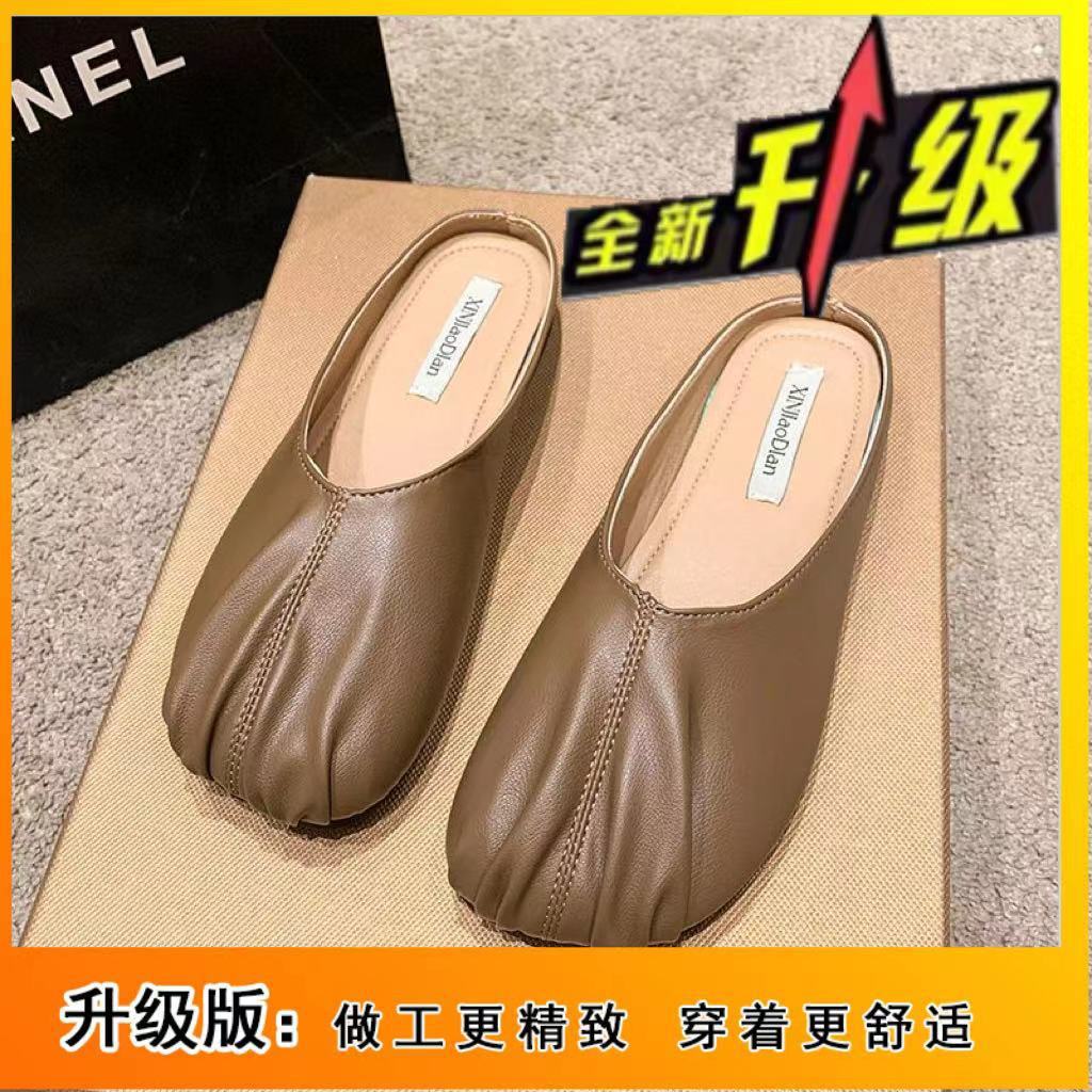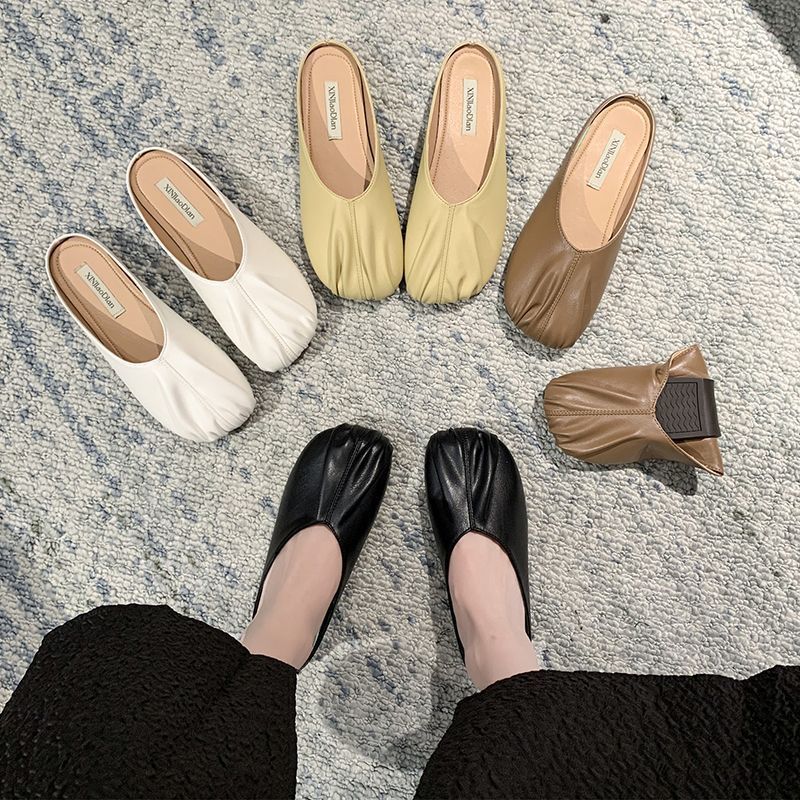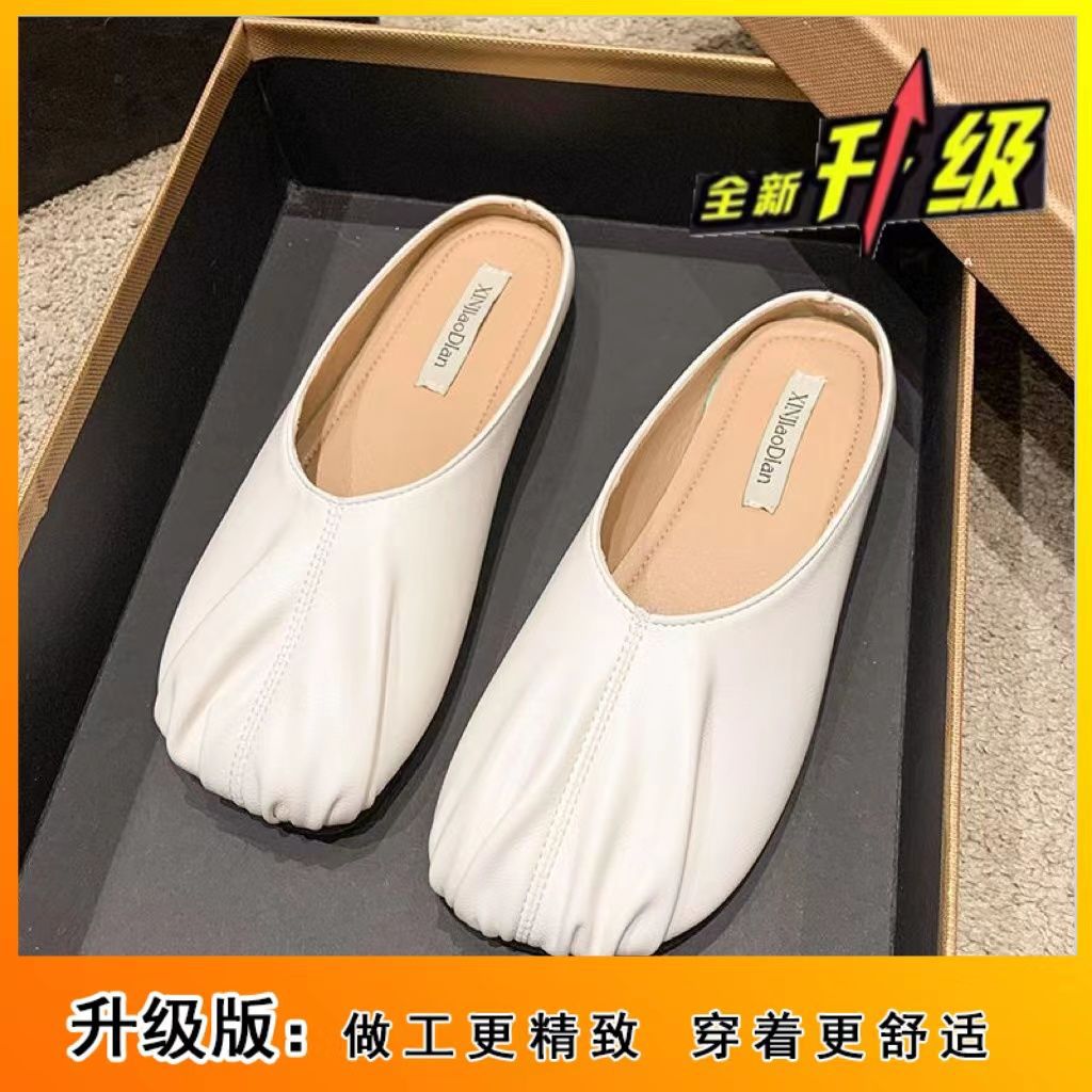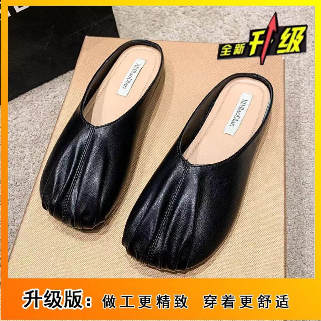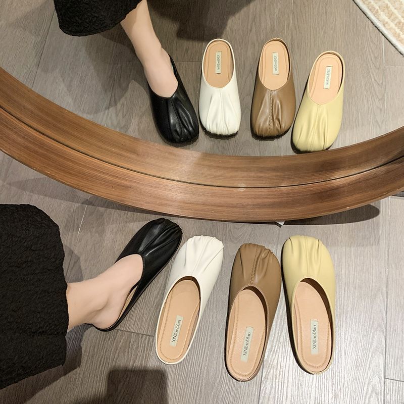 包头半拖鞋女外穿夏新款凉拖平底褶皱奶奶鞋浅口豆豆单鞋软底