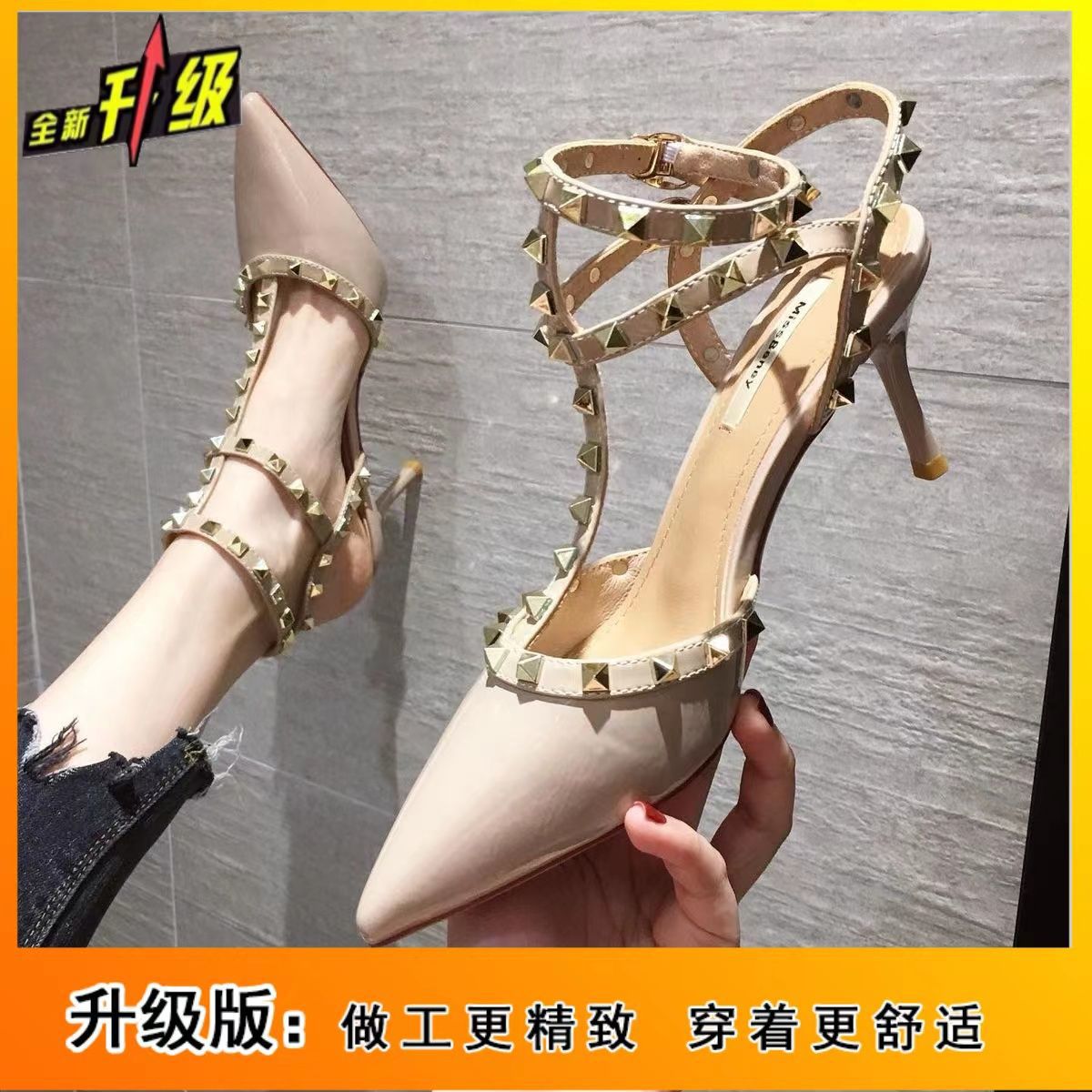 三环铆钉高跟鞋春季新款网红性感尖头细跟凉鞋一字扣带单鞋女