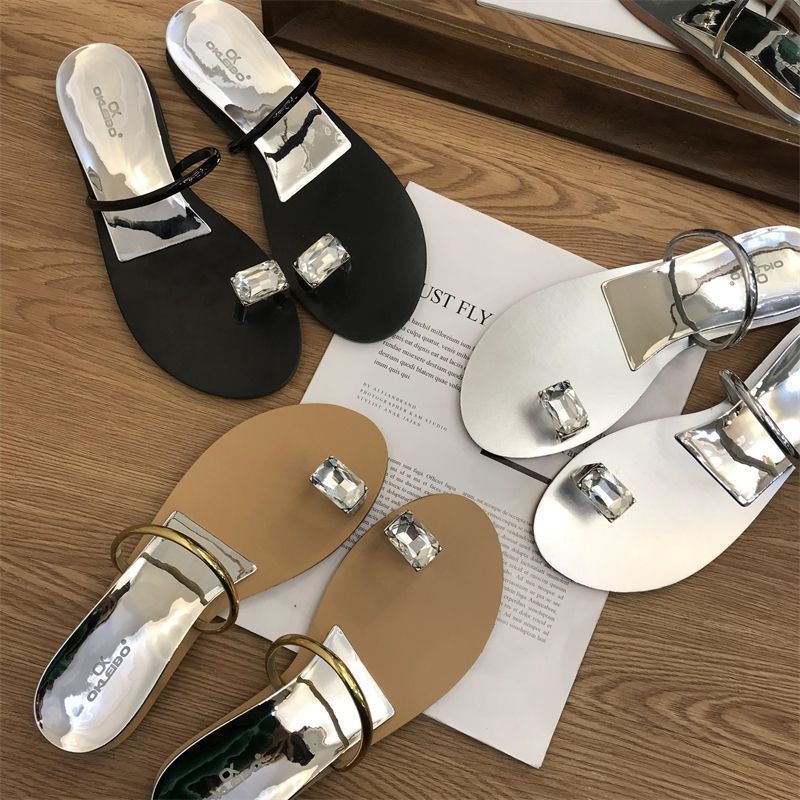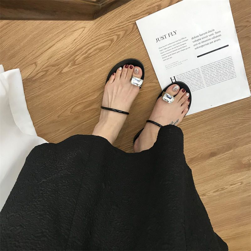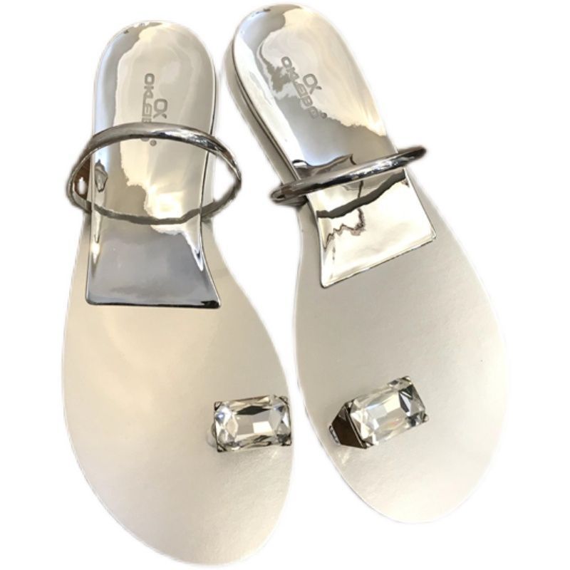 一颗鸽子蛋水钻拖鞋女夏外穿夏新款银色一字带平底套趾凉拖