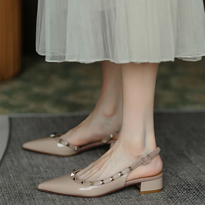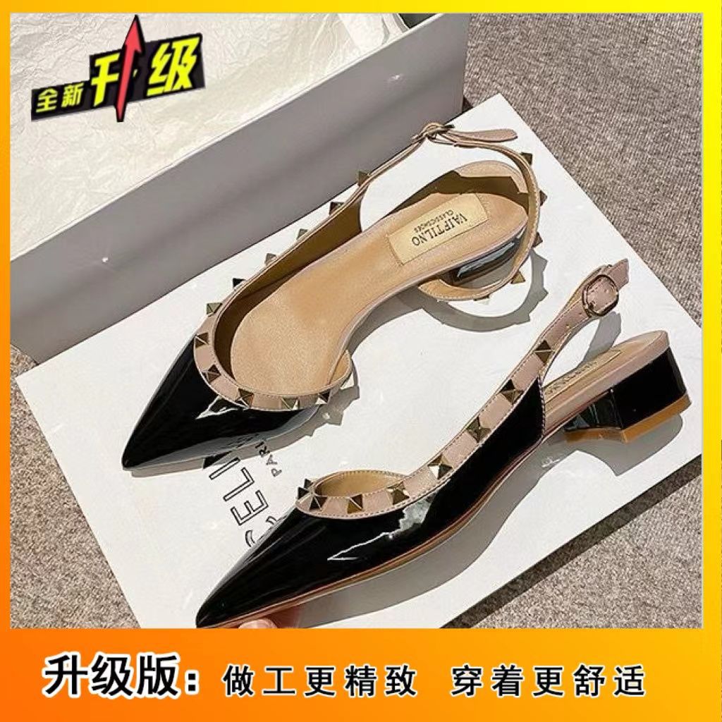 春季新款一字扣带尖头铆钉中跟包头粗跟柳丁鞋外穿凉拖鞋女