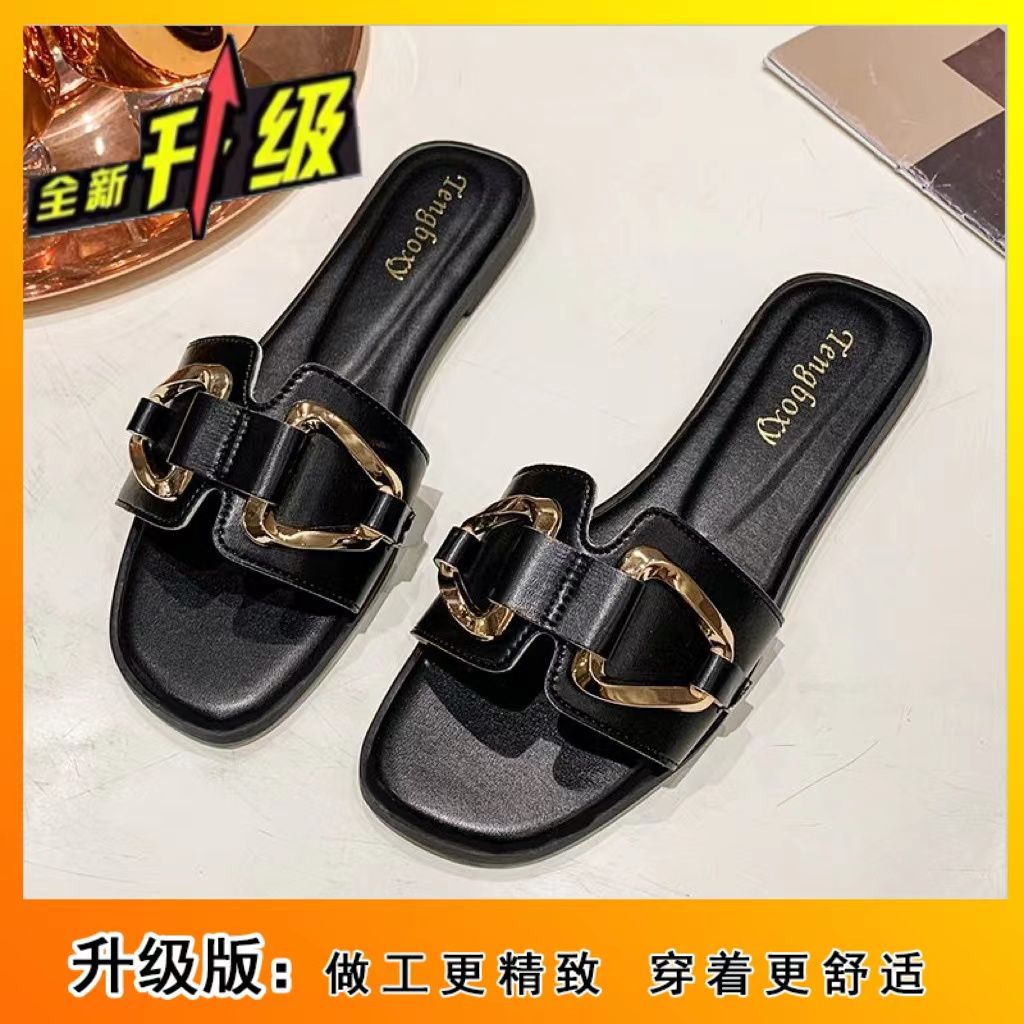 新款平底夏季凉拖鞋女外穿金属装饰一字凉拖平跟洋气女鞋
