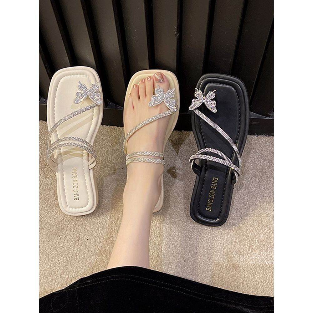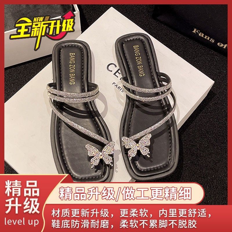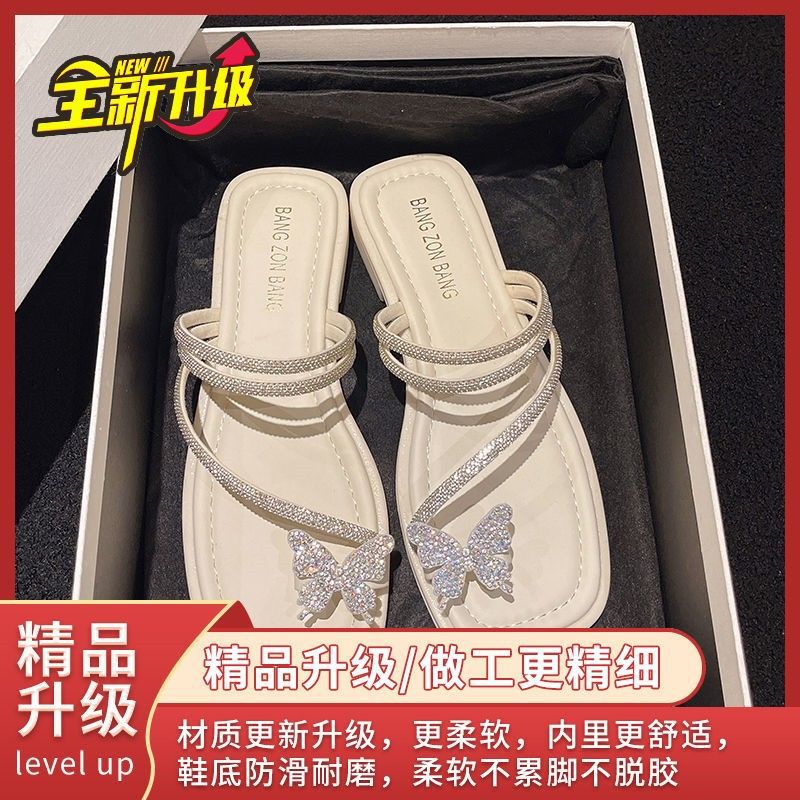 夏季新款ins韩版蝴蝶结凉鞋女平底仙女水钻夹趾凉拖鞋女外穿
