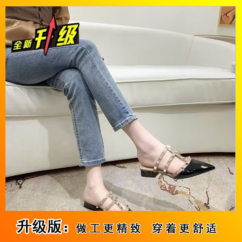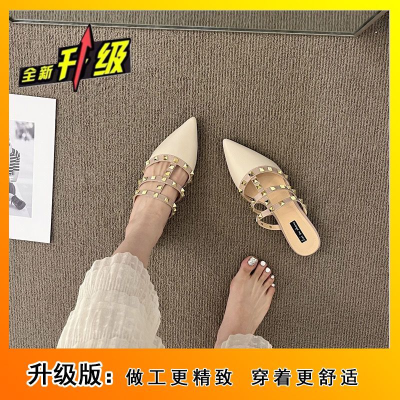 法式高级感铆钉包头半拖鞋女春夏平底外穿韩版漆皮尖头凉拖鞋