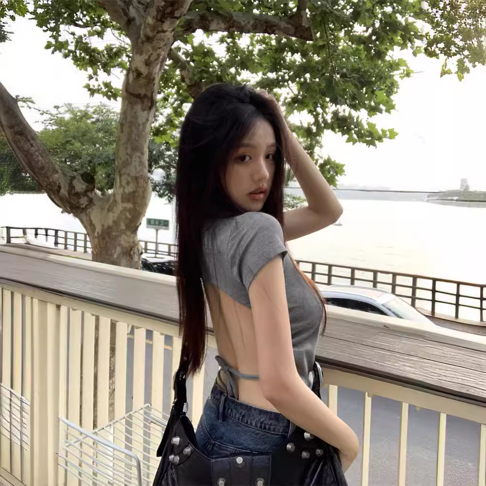 人棉露背绑带短袖t恤女辣妹风纯欲修身显瘦镂空性感短款上衣欧货