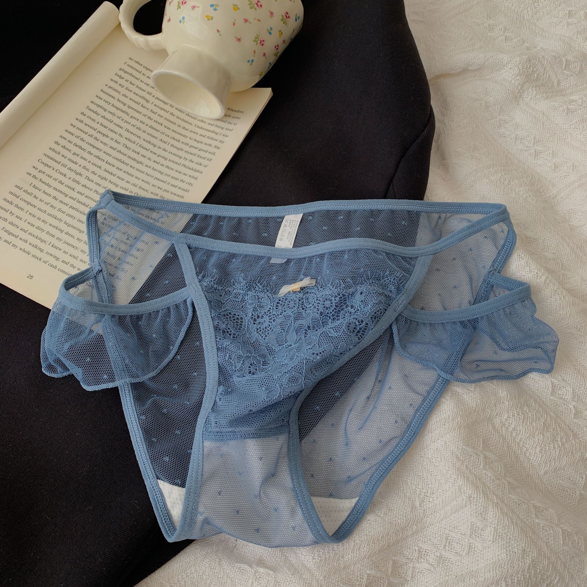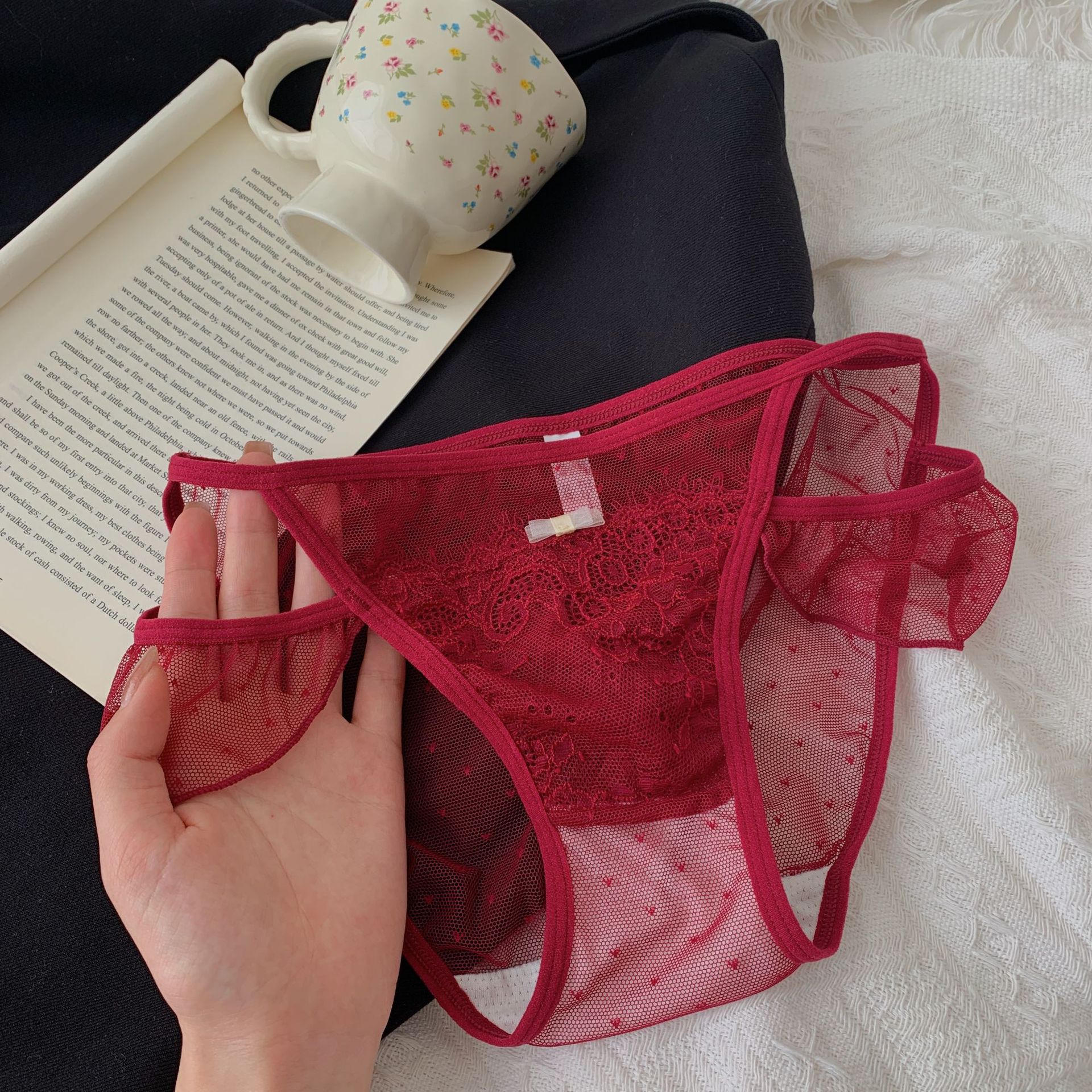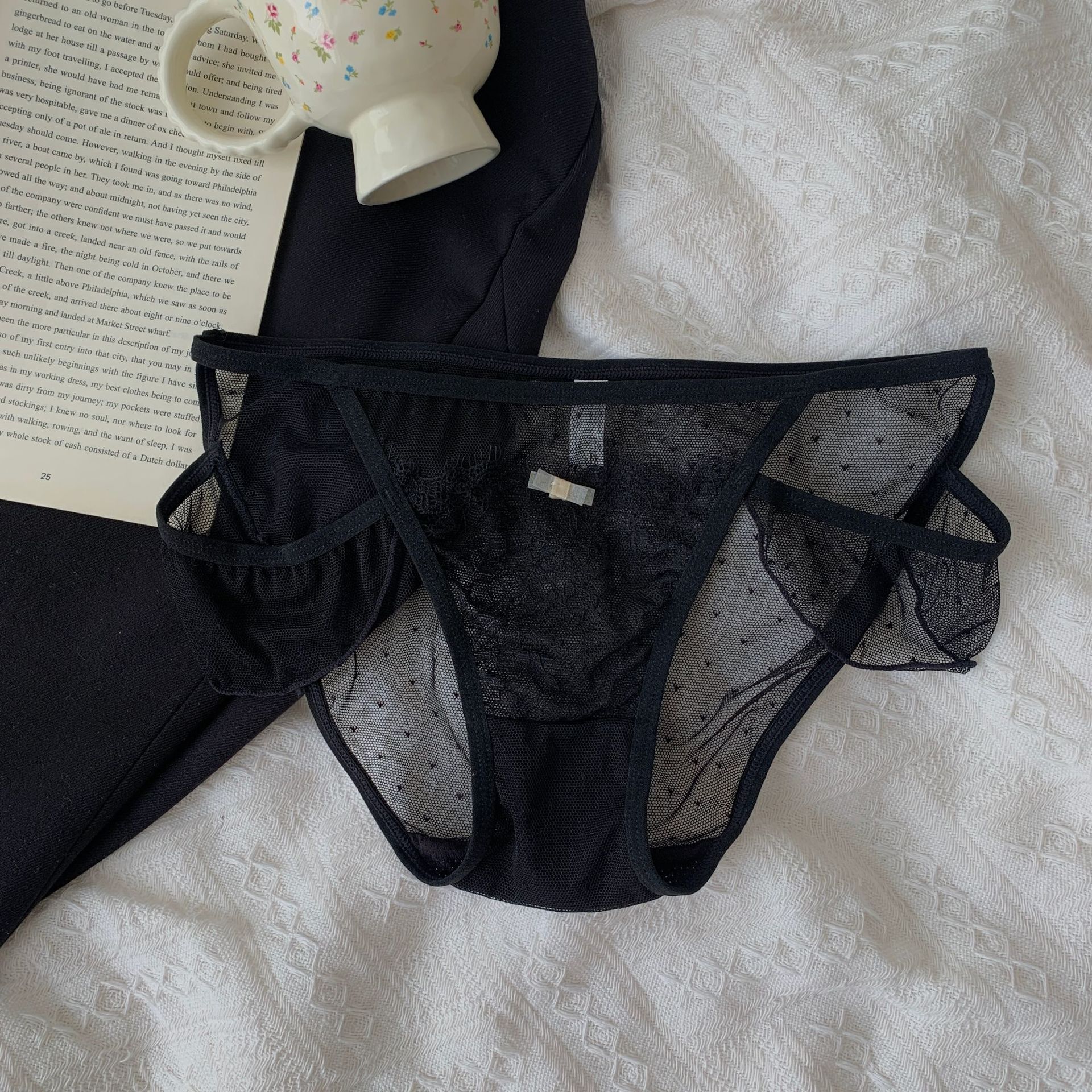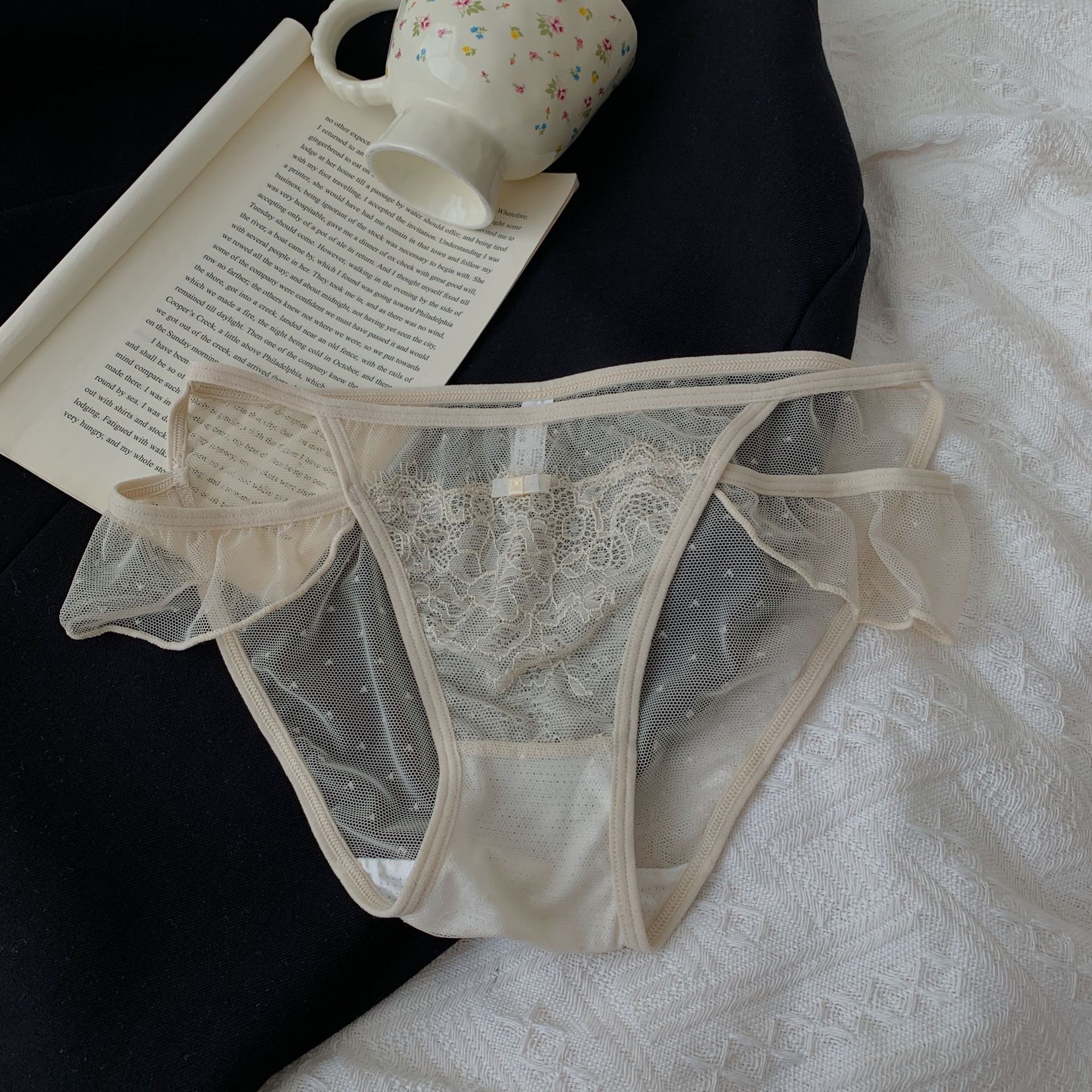 法式蕾丝纯欲中腰高弹网纱蝴蝶结透明镂空点点简约包臀女士三角裤