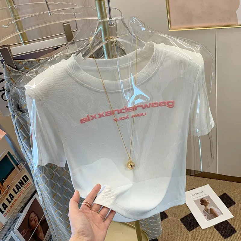 纯色字母短袖t恤女夏新款时尚气质修身减龄百搭小众别致上衣