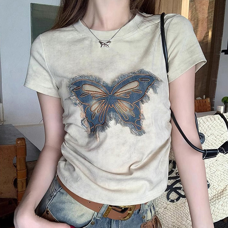 纯棉正肩短袖t恤女夏季新款美式蝴蝶结设计感小众短款扎染上衣