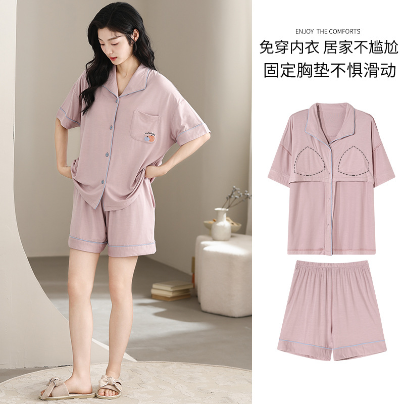 莫代尔睡衣女夏季短袖短裤新款简约开衫带胸垫可外穿家居服