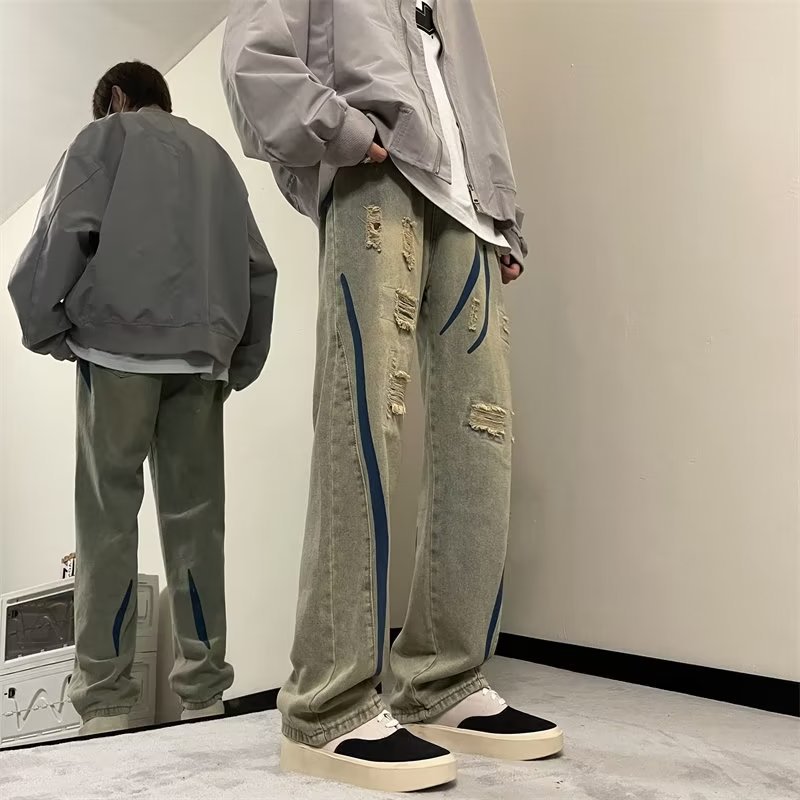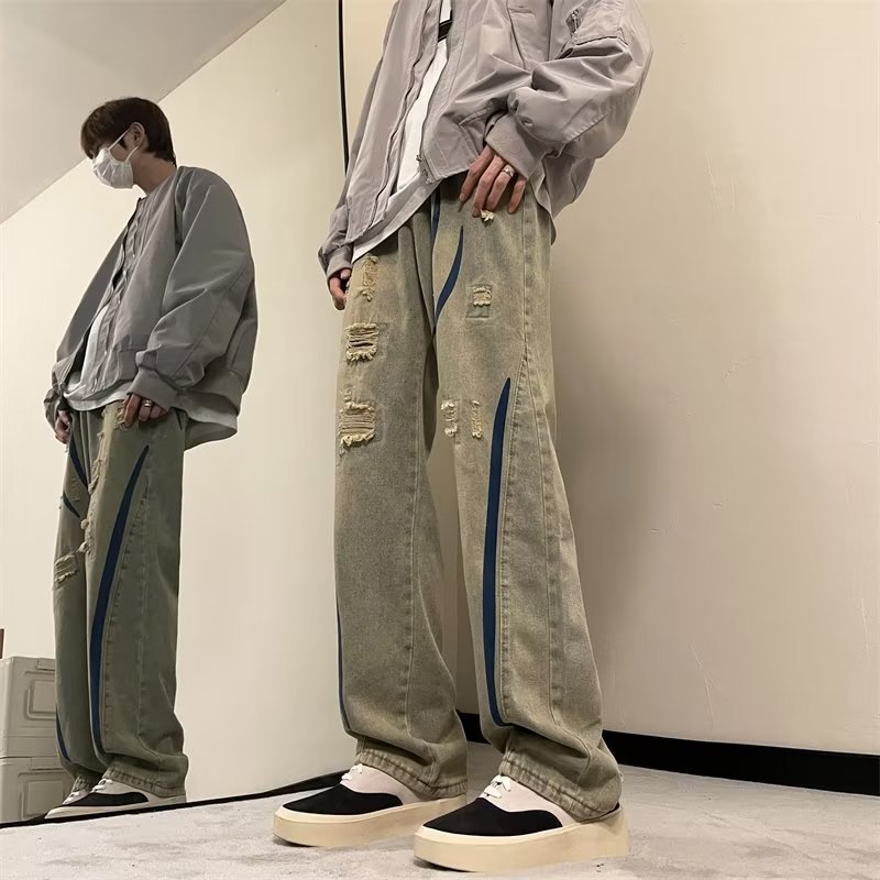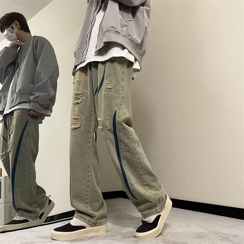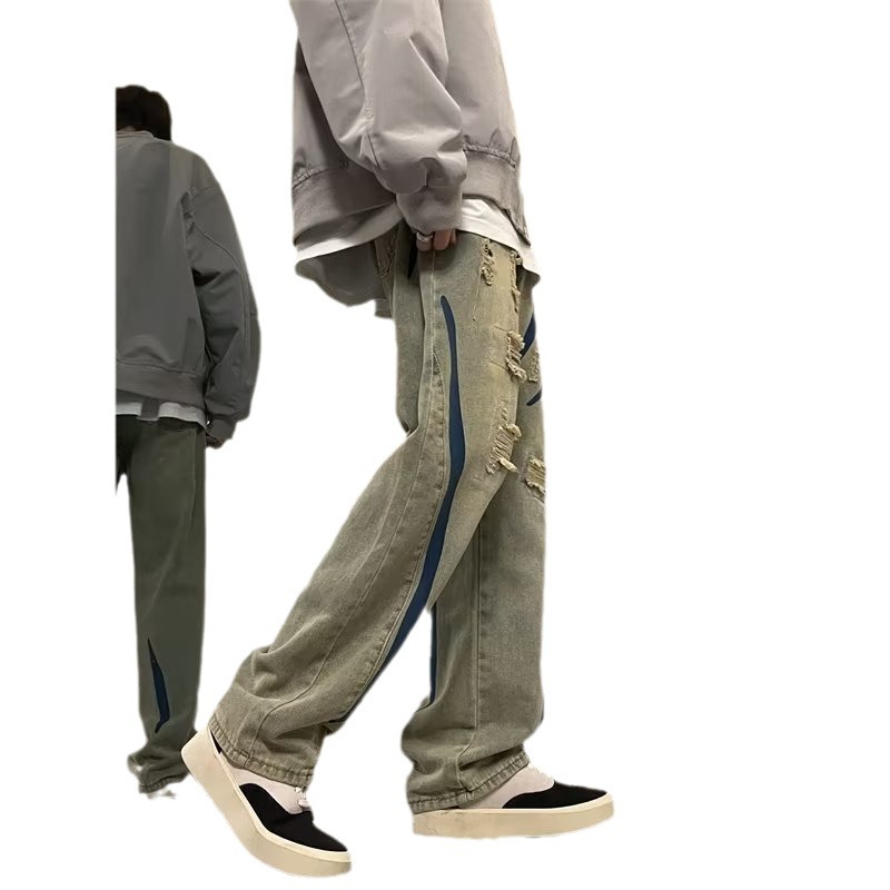 美式高街黄泥抓痕复古直筒裤牛仔裤男宽松水洗显瘦阔腿裤子春夏